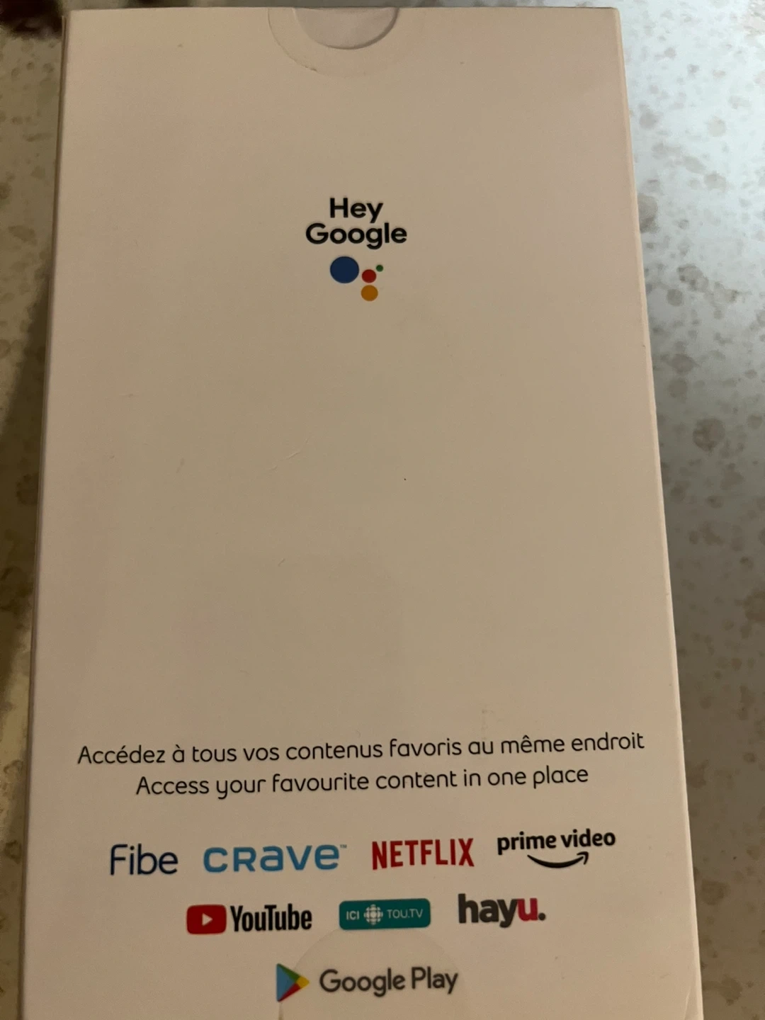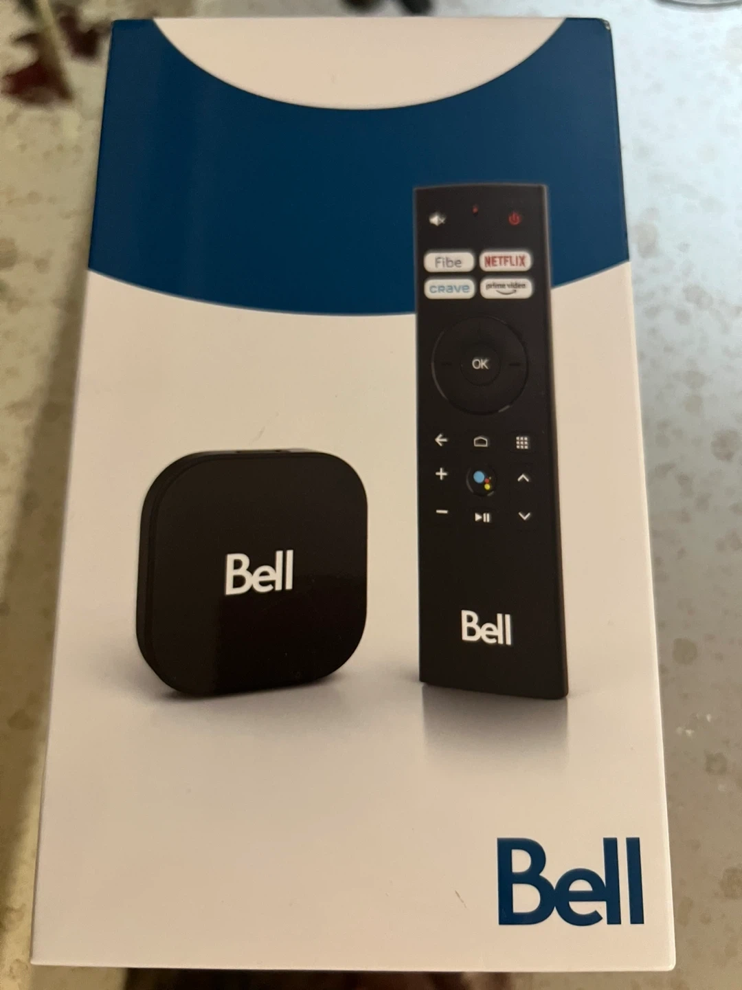 This is a Bell Streamer with its remote. It's designed to provide access to your favourite content all in one place. Use voice commands with Google Assistant for easy navigation. It supports various streaming services like Fibe, Crave, Netflix, Prime Video, YouTube, and Google Play. Never used or opened