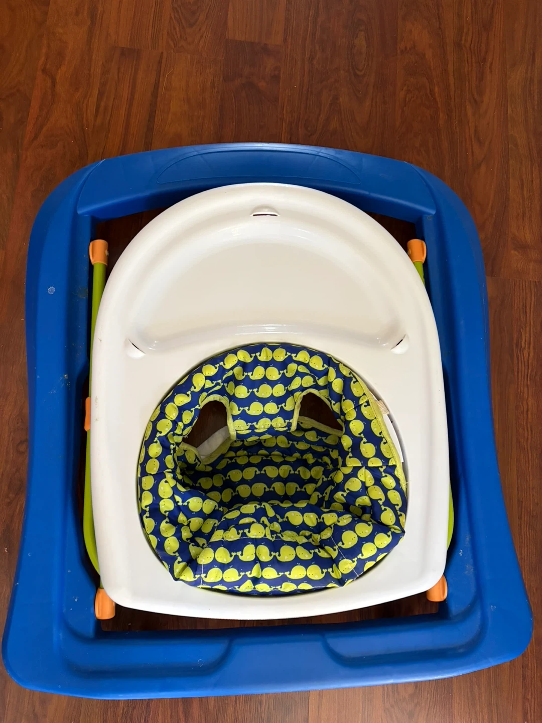 A blue and white baby walker with a fun green and yellow whale print seat. It's designed to help little ones explore their surroundings. Tray is wipeable for easy cleanup!