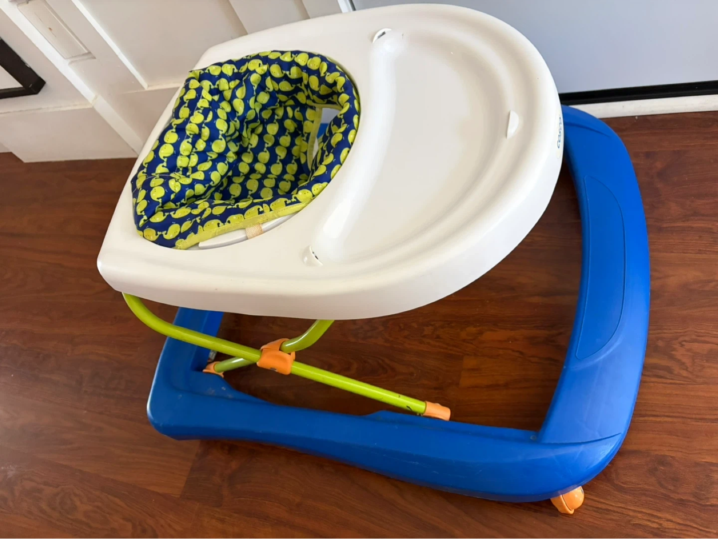 A blue and white baby walker with a fun green and yellow whale print seat. It's designed to help little ones explore their surroundings. Tray is wipeable for easy cleanup!