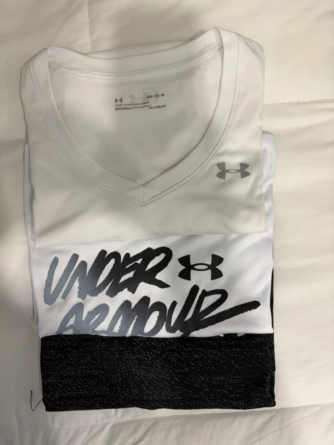 White Under Armour V-neck t-shirt. Size MD/M. Made with HeatGear fabric. Loose fit. Selling a bundle of 3 for $20