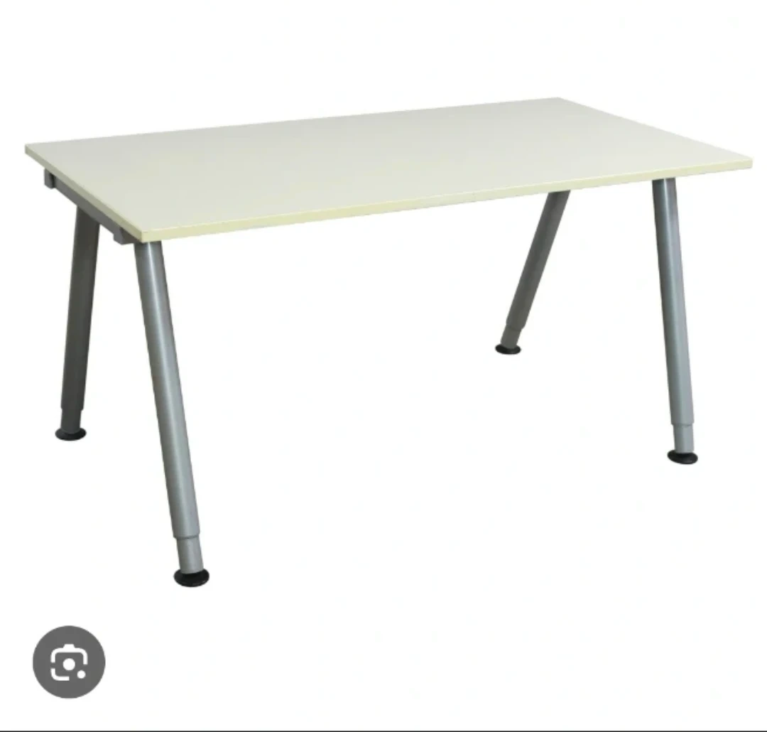 A rectangular white tabletop with four silver legs. The legs have adjustable feet for levelling. Great for a desk or workspace!