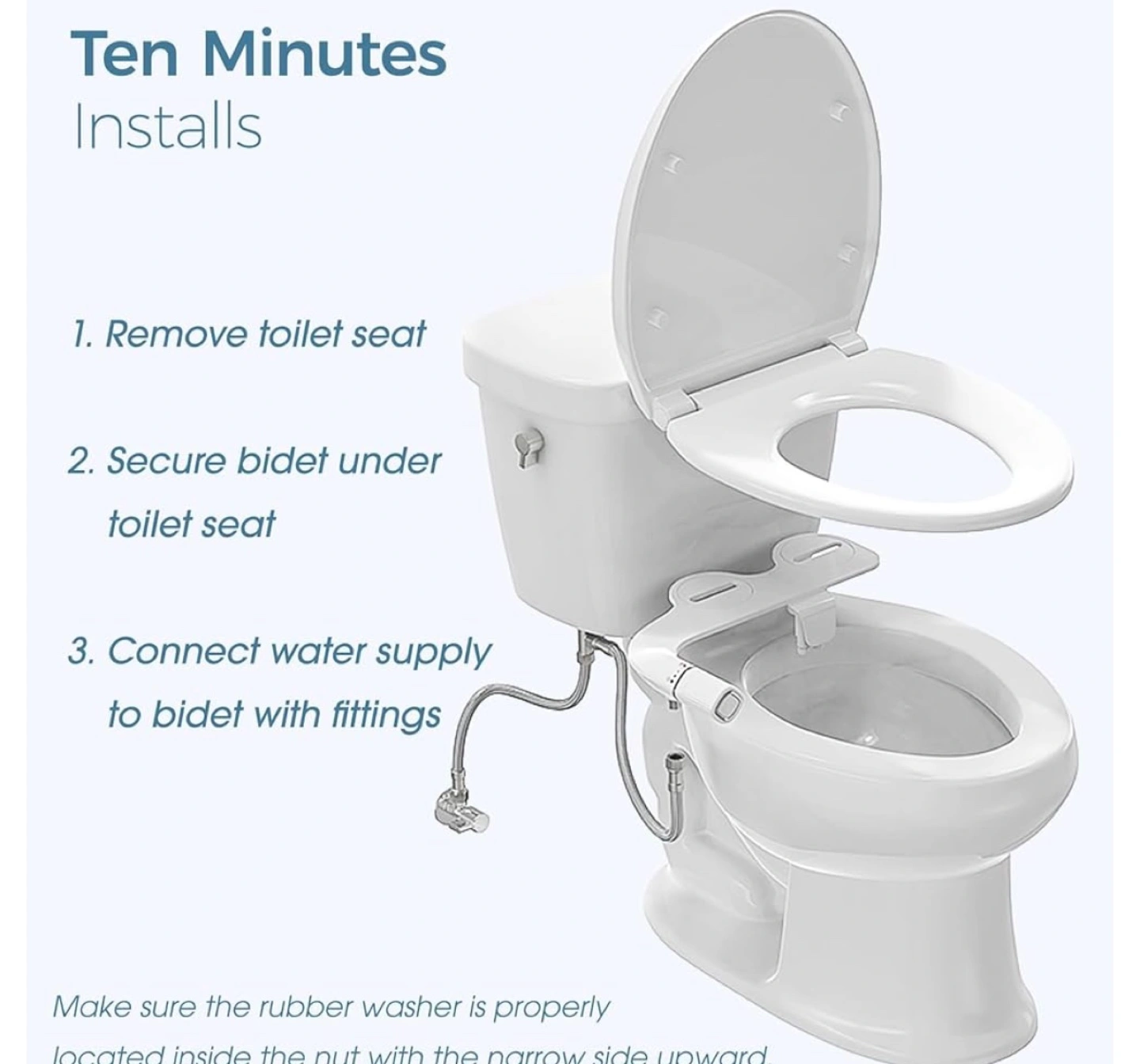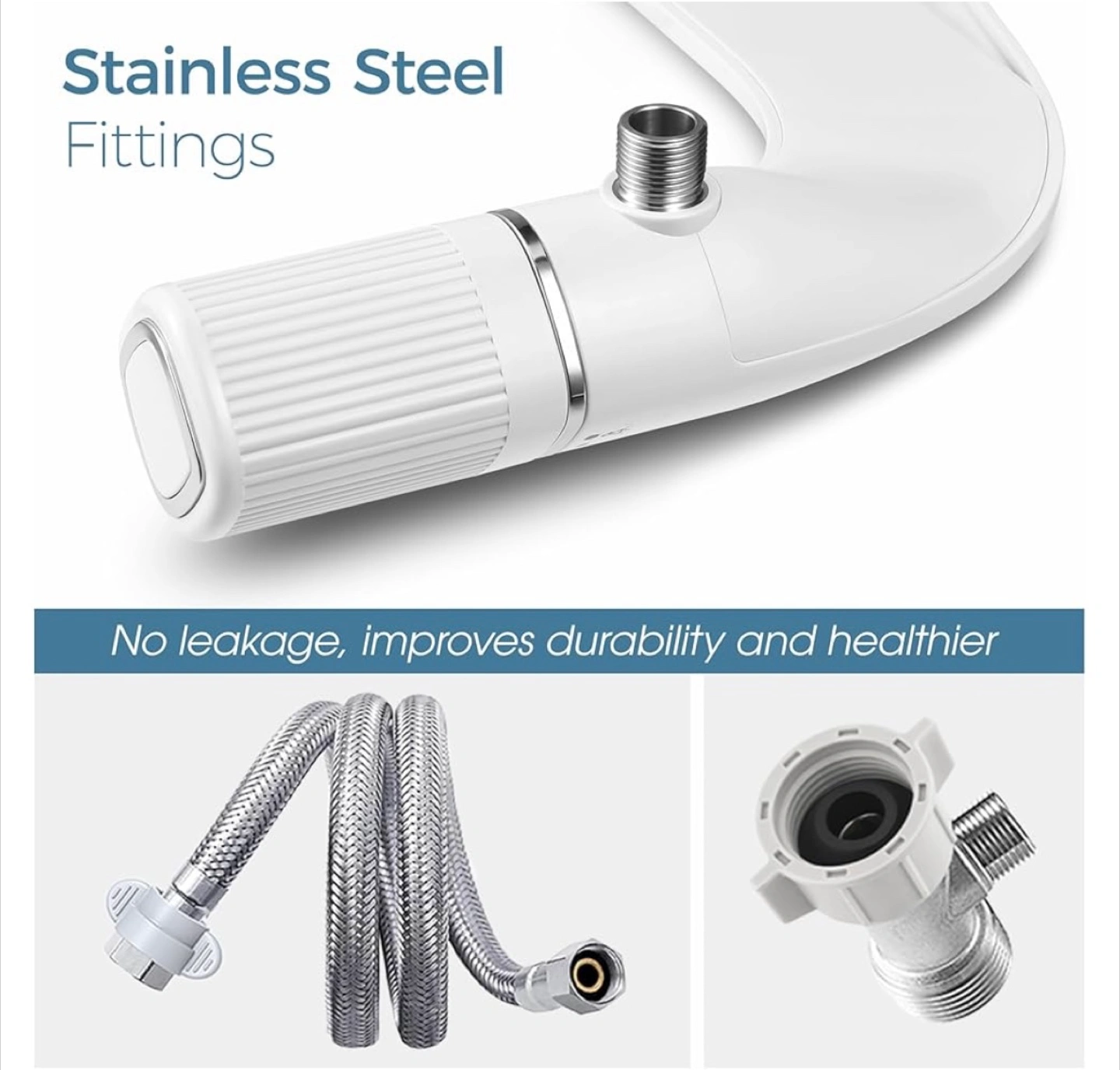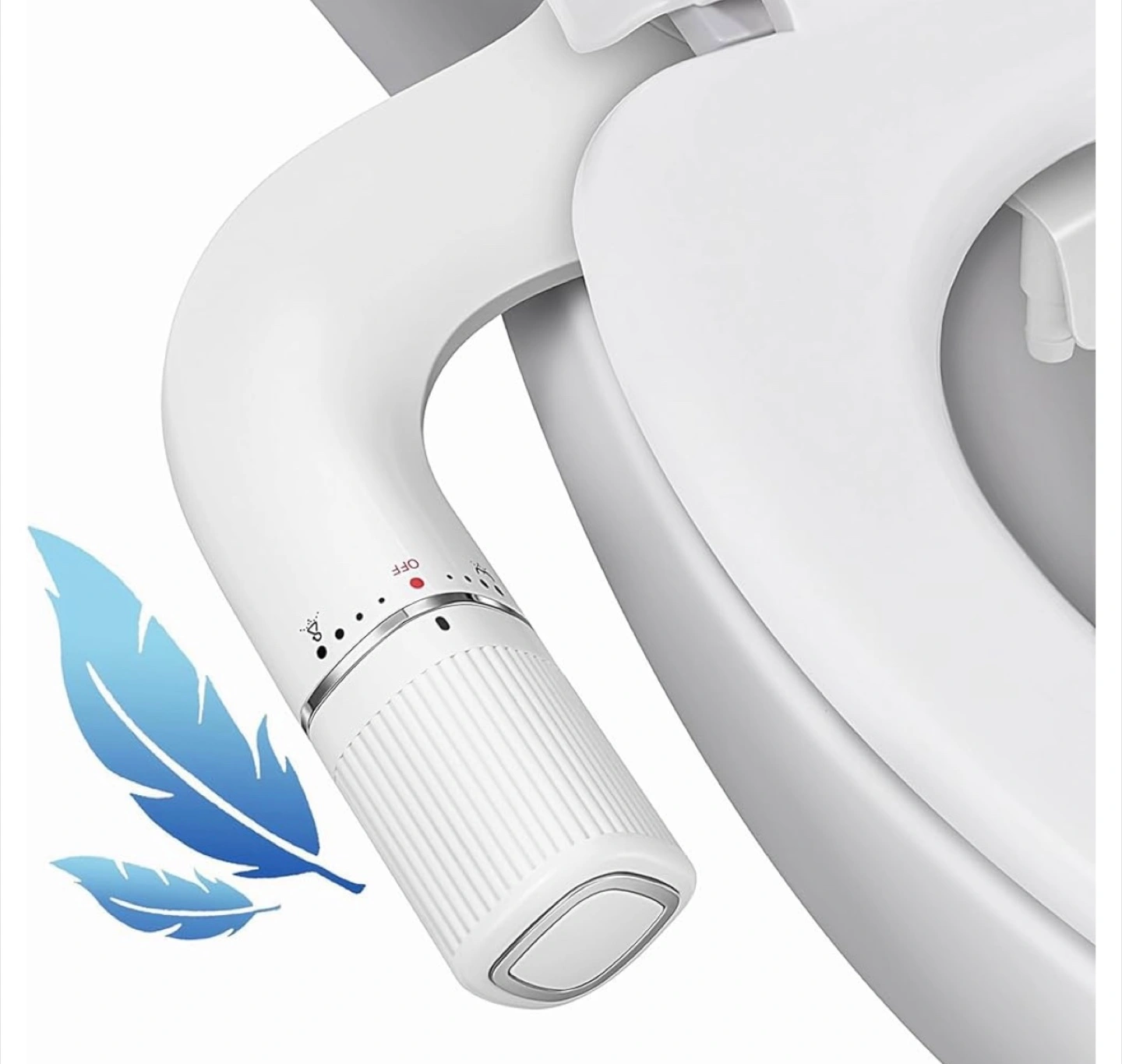 Non-electric bidet toilet attachment. Features dual nozzles for front and rear wash. Stainless steel fittings ensure durability and prevent leaks. Easy installation; takes about ten minutes. Compatible with most toilets.