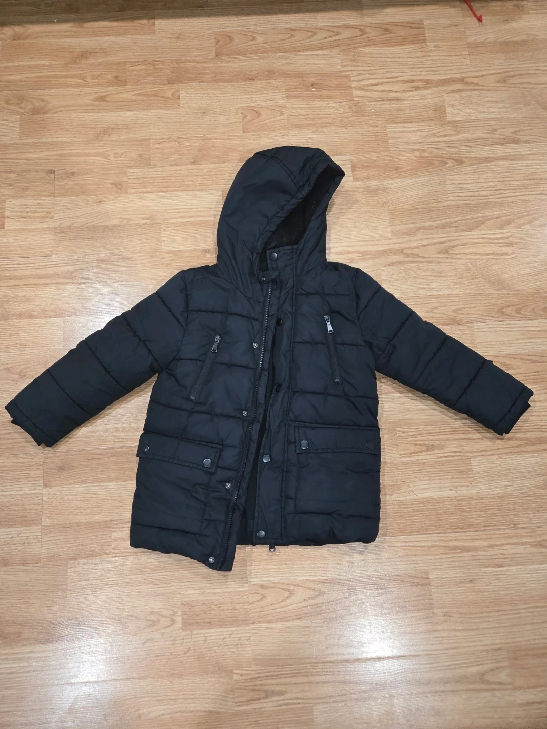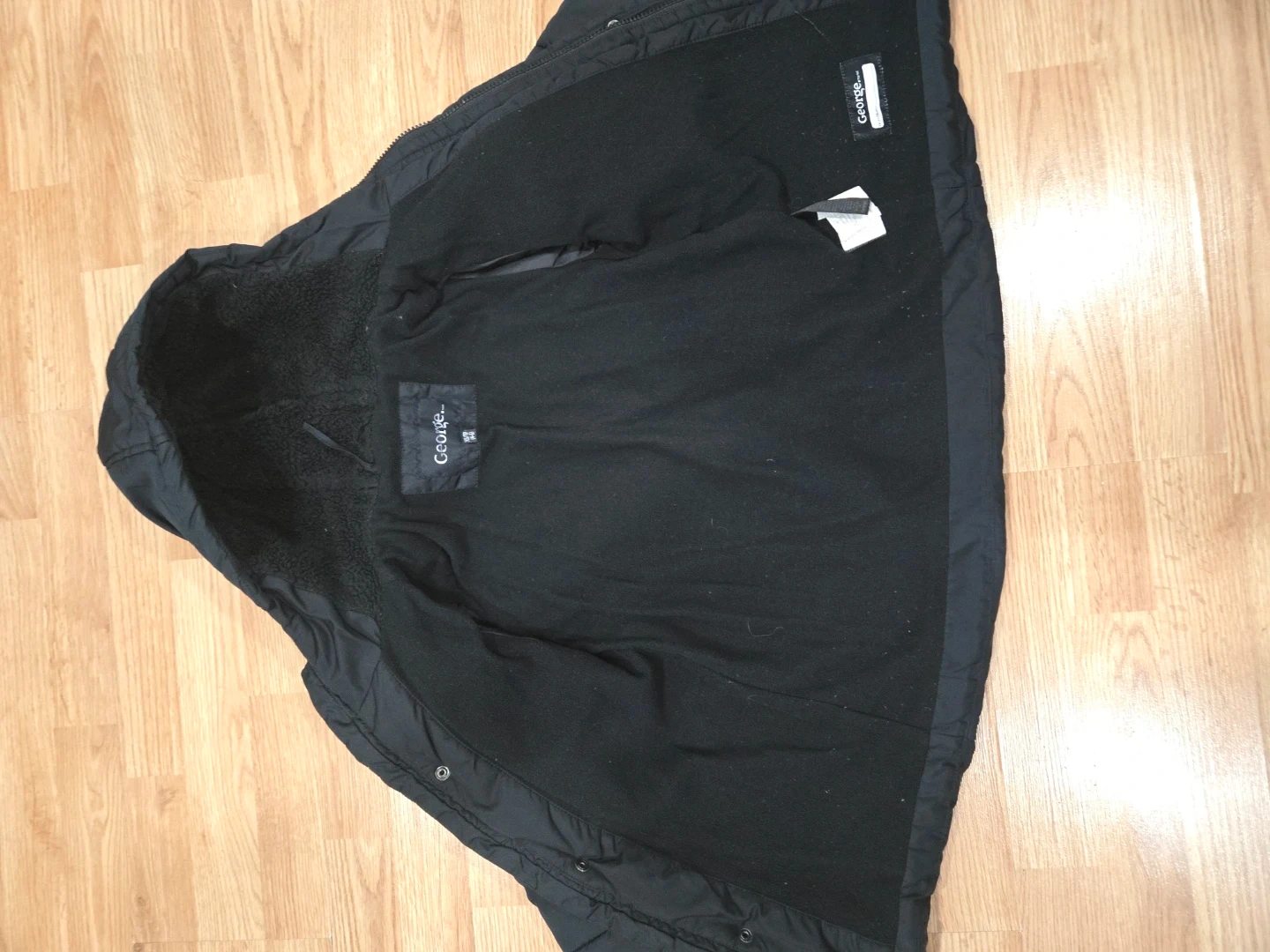 A black puffer winter jacket by George. It's a size XS (4-5). Lined with cozy fleece.