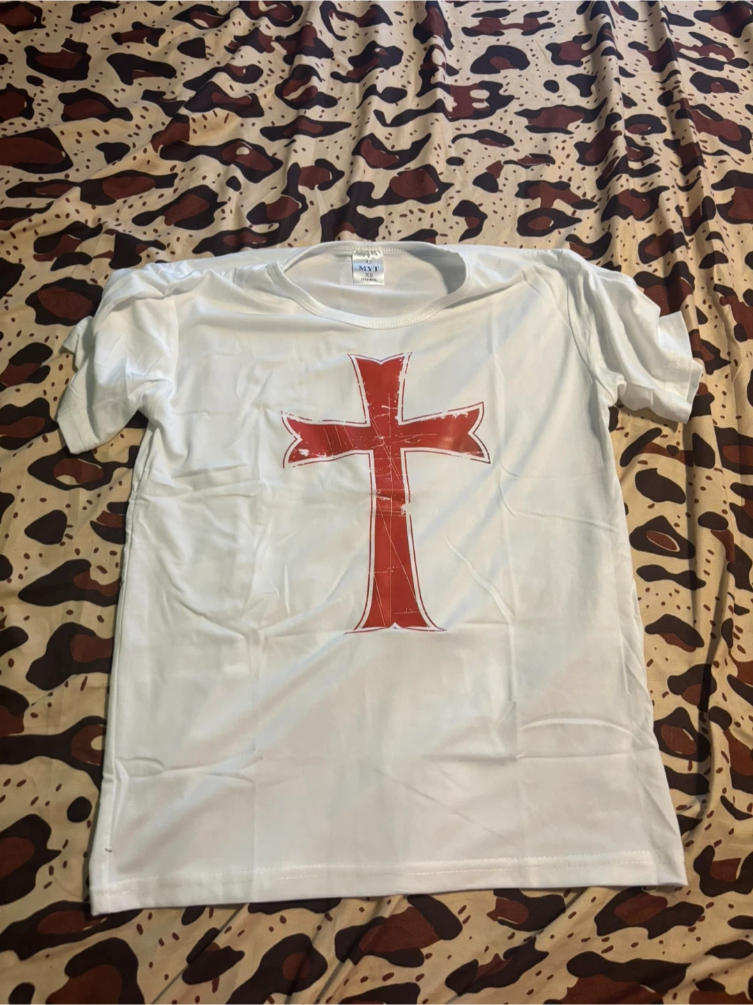 White t-shirt featuring a distressed red Templar Cross graphic on the front. It's a size XS. This shirt's design is eye-catching! It's great for themed events or casual wear.