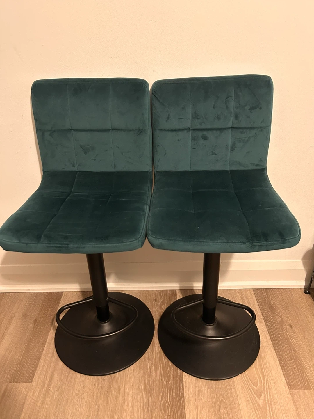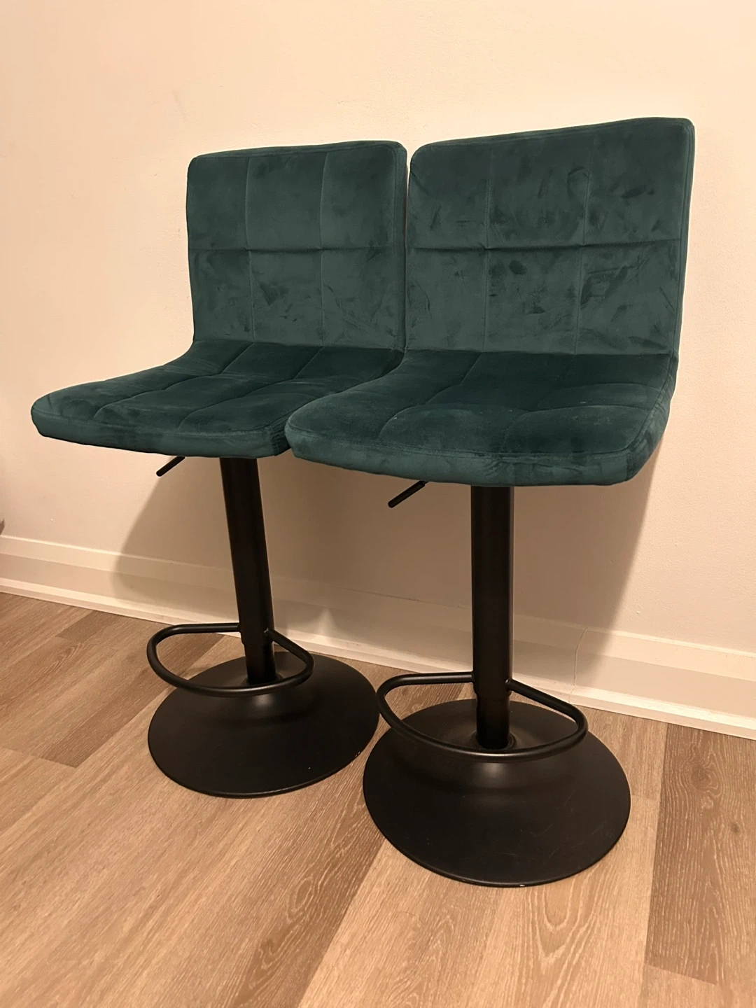 Two teal velvet bar stools with adjustable height. These stools have a tufted seat and a sturdy black base with a footrest. They're great for a kitchen island or home bar.