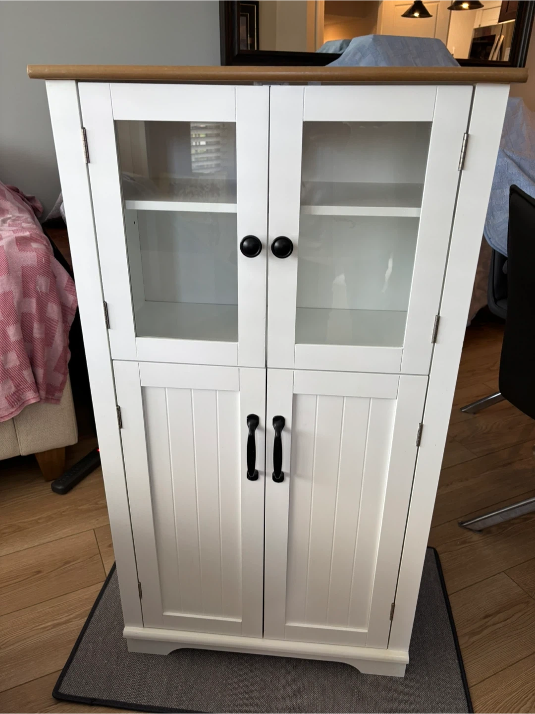 A charming white display cabinet featuring glass doors on the upper section and solid doors below. It has a natural wood top and offers ample shelving space for storage or display. This cabinet would be useful for organizing kitchenware or showcasing decorative items.