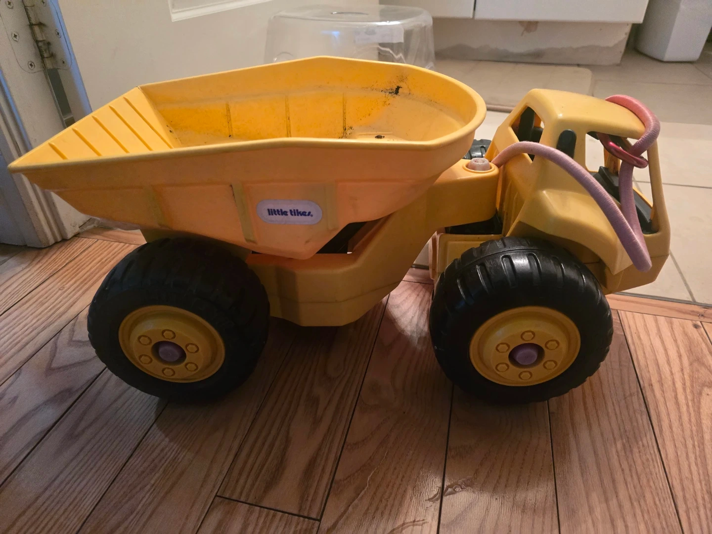 This is a Little Tikes yellow dump truck and loader toy. It's made of durable plastic and is perfect for outdoor play. Kids can use it to haul dirt, sand, or toys. It's a classic toy for imaginative adventures!