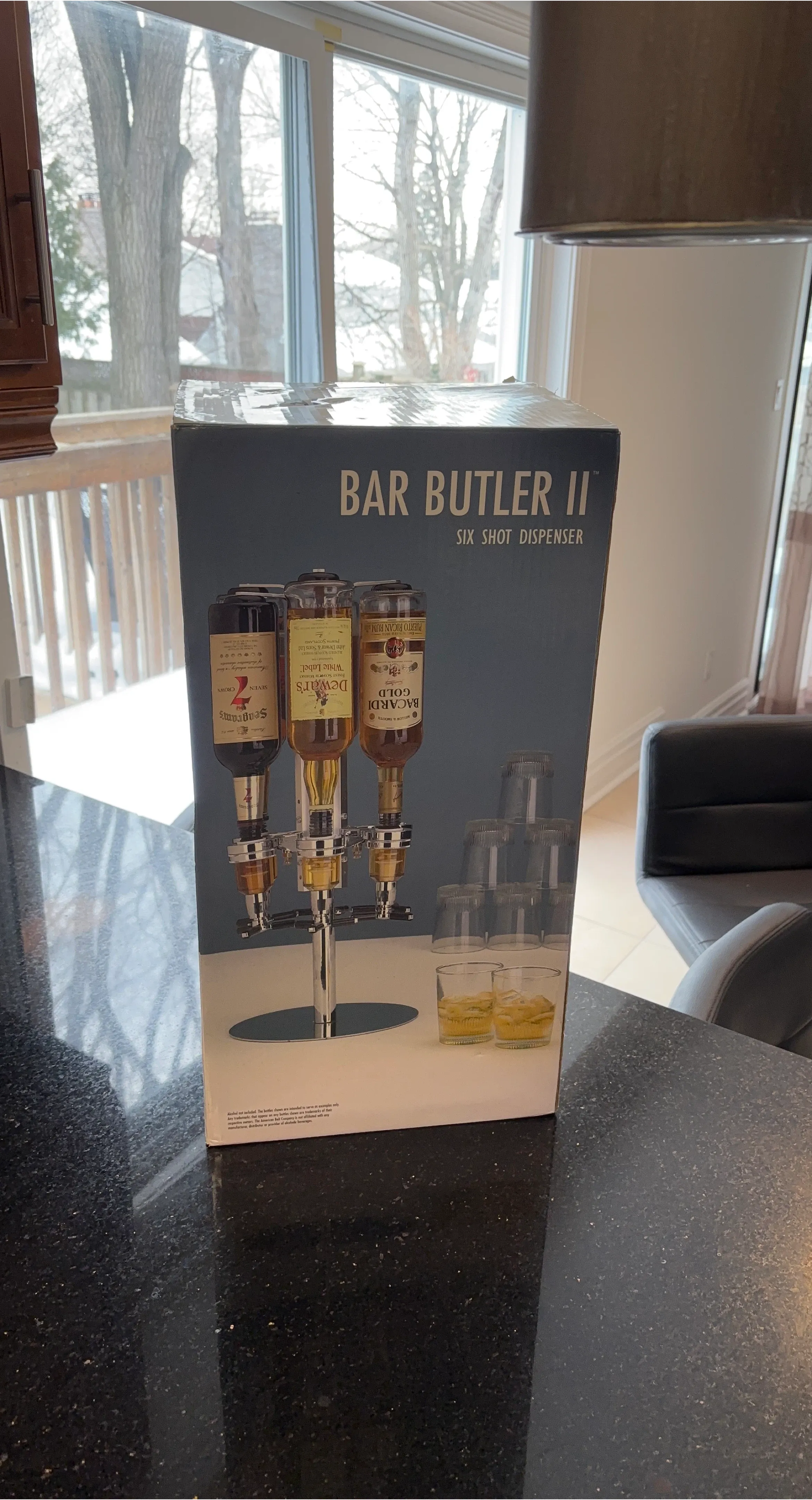 This is the Bar Butler II Six Shot Dispenser. It includes a chrome dispenser for six bottles. Comes with a base and dispensing mechanism.