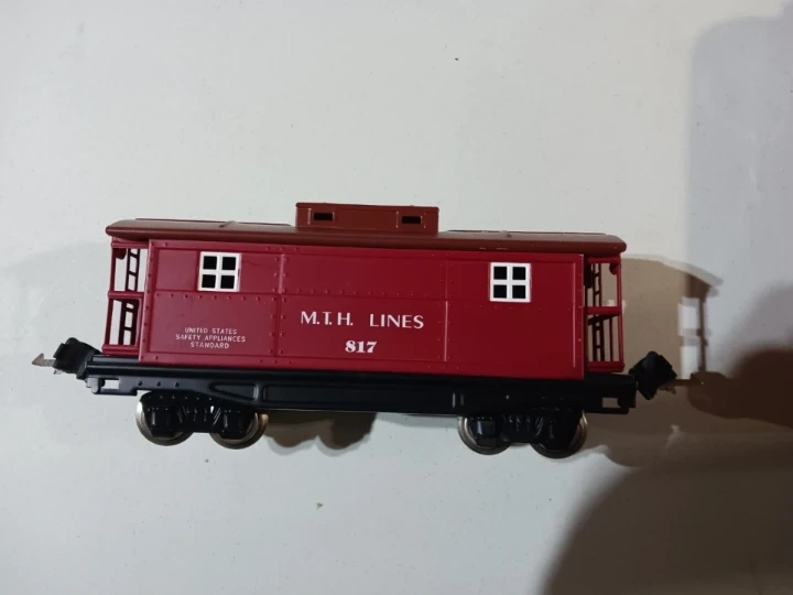 This is an M.T.H. Lines caboose train car. It's red with white window details. The car is numbered 817.great shape I only do pickup