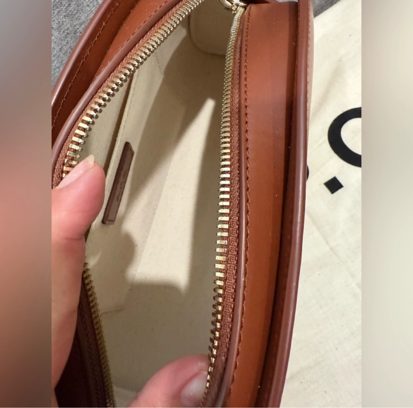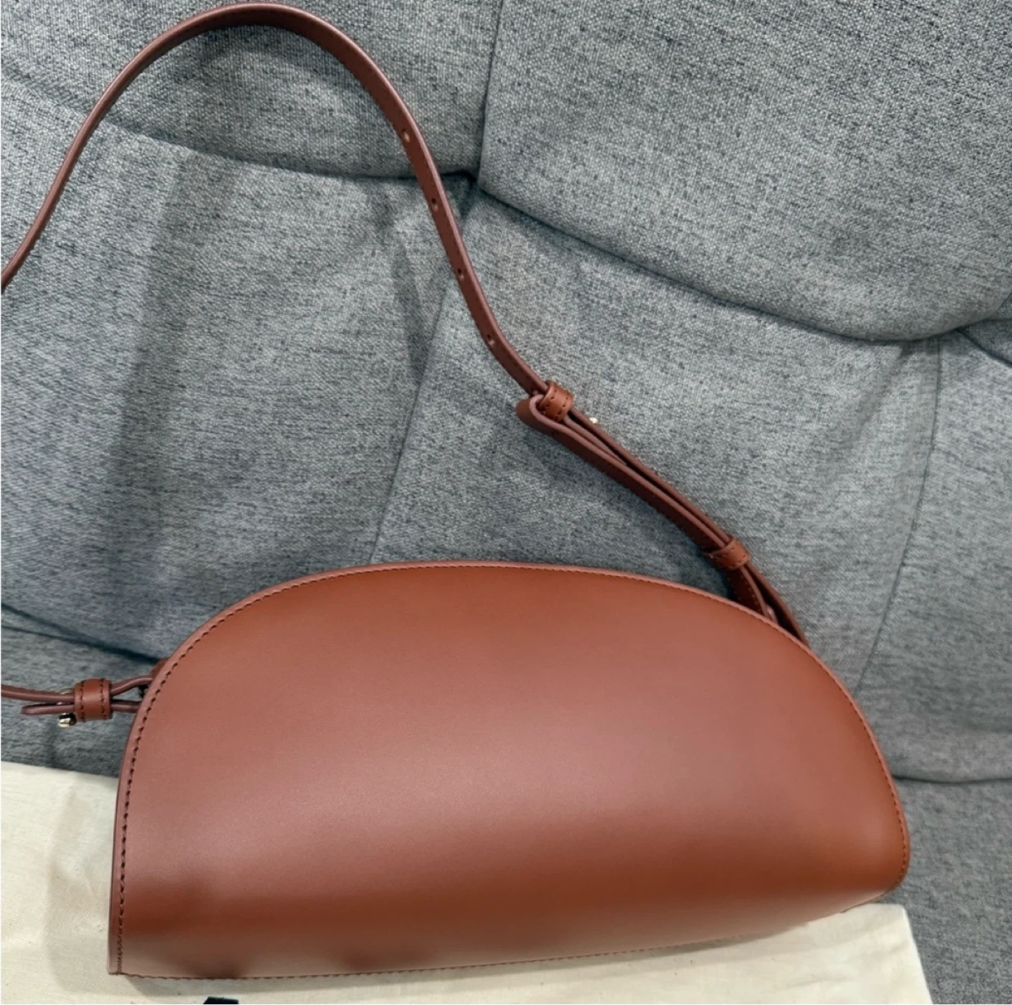 Like new condition, no flaws to mention. Worn only twice. I don’rt reach for it as much as I thought I would. Purchased few months back through online. Crafted from rich brown leather, this shoulder bag features a sleek, minimalist design with a distinctive half-moon shape. Its adjustable strap ensures comfort and versatility, making it an ideal choice for everyday use.