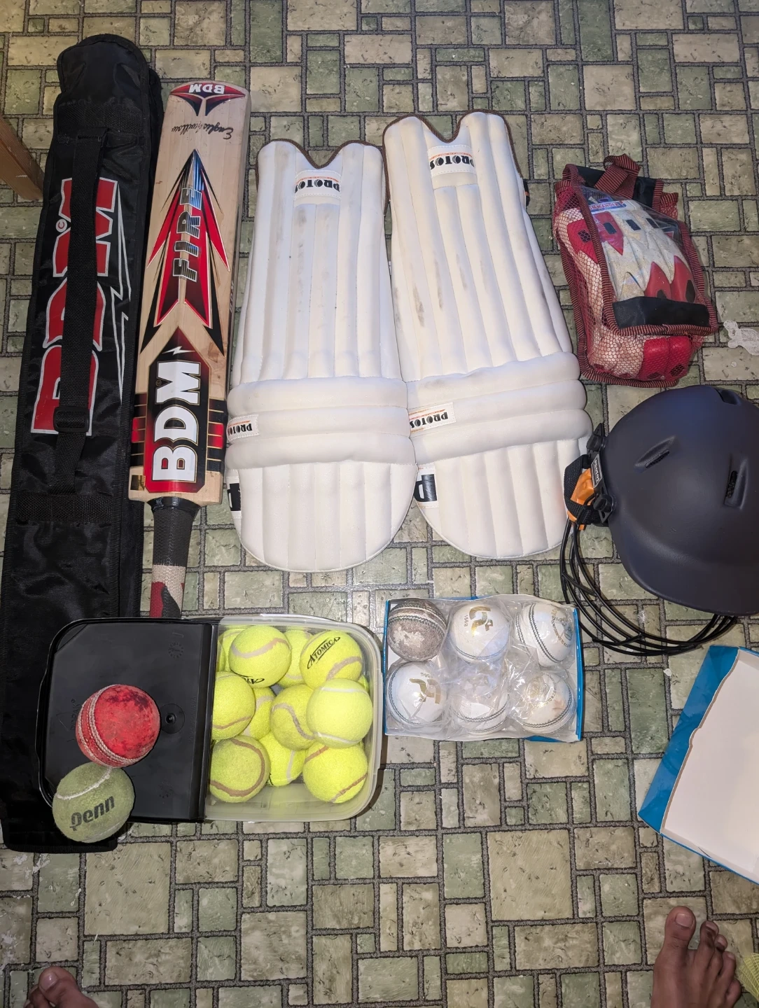 This set includes a BDM "Fire" cricket bat, a pair of white protective pads, and a collection of cricket balls. The bat comes in a black carry bag. It's suitable for cricket practice or casual play.