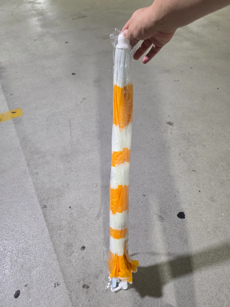 Selling a beach umbrella with yellow and white stripes. It's still in its original packaging. Perfect for sunny days at the beach or park!