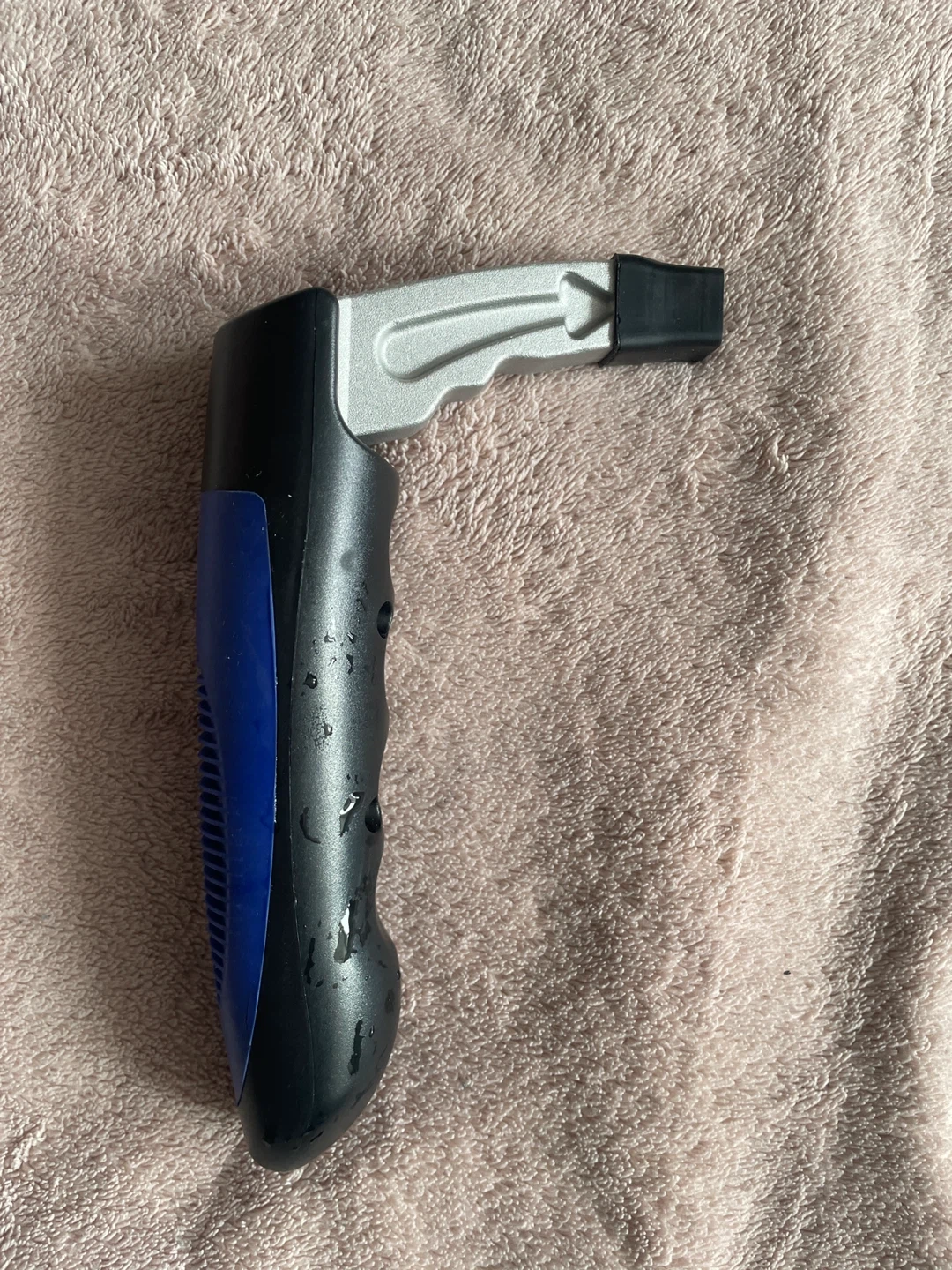 This is a black and blue ergonomic handle for a water sprayer. It has a comfortable grip and is designed for easy use. This handle is ideal for attaching to a hose for gardening or car washing.