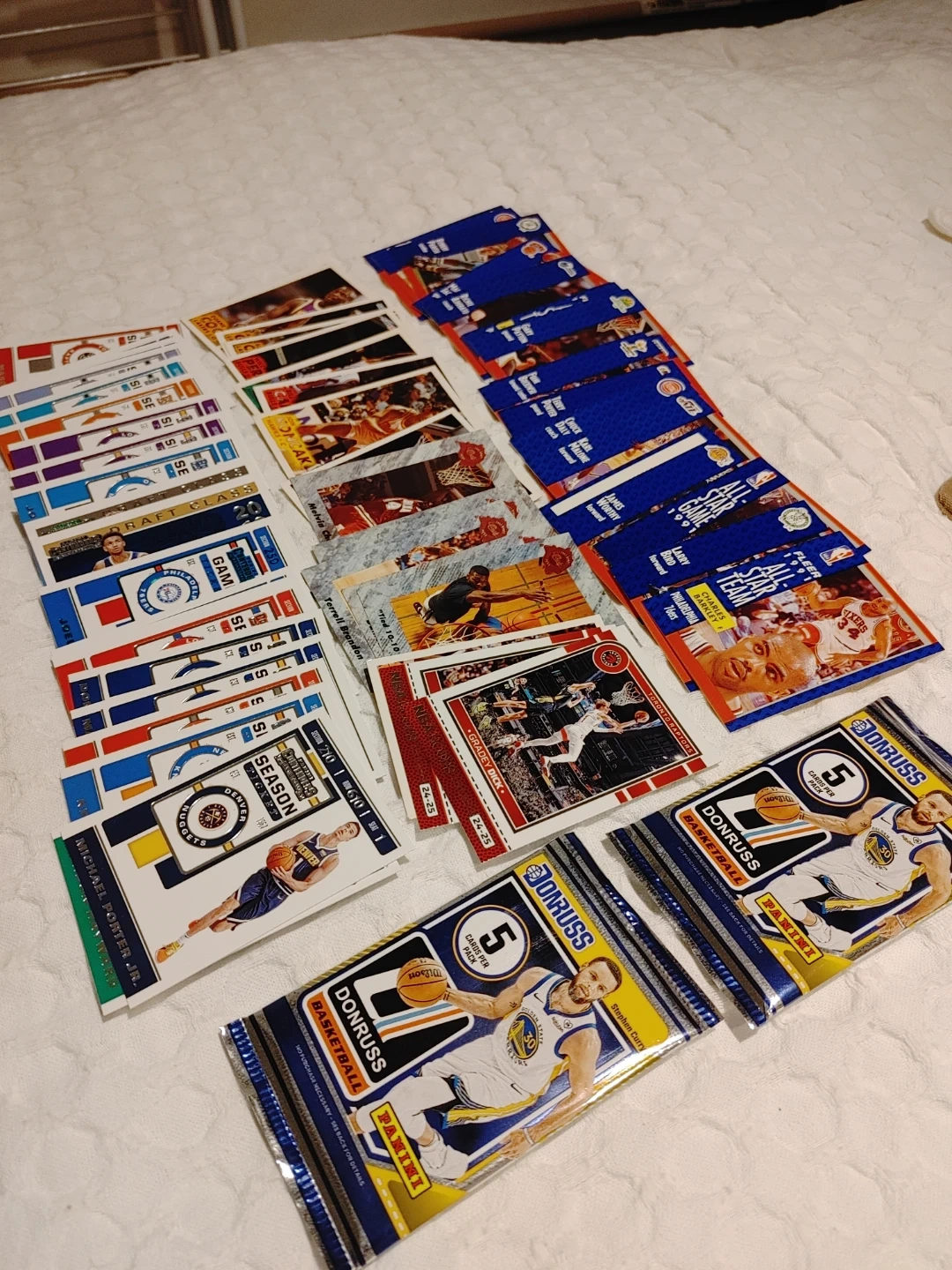 Collection of Panini Donruss 2024-2025 basketball cards and packs. Includes individual cards and sealed packs featuring players like Michael Porter Jr. and Stephen Curry. Also contains older Fleer cards.