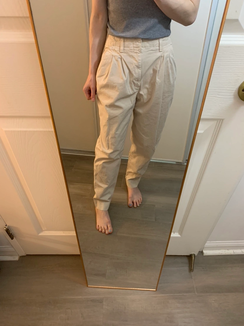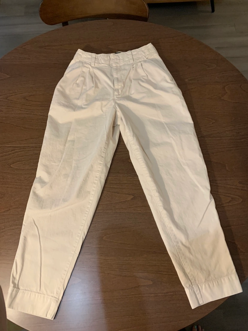 Khaki trousers with a relaxed, baggy fit. Only worn once or twice. Please see photos for approximate measurements. For reference, I am 5’2”.