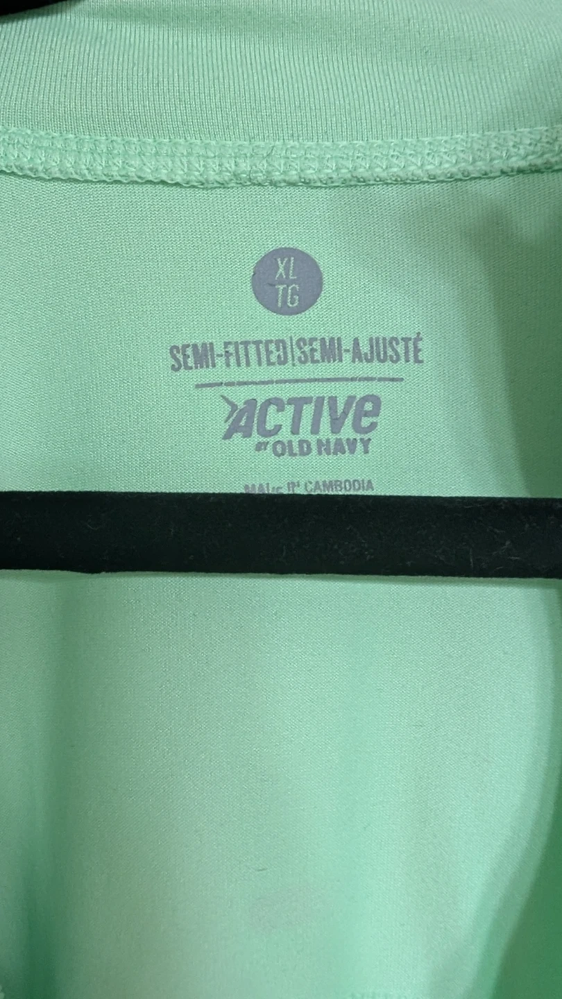 This is an Old Navy Active long sleeve zip-up shirt in a light mint green colour. It's a size XL with a semi-fitted cut. It's made from a lightweight, breathable fabric.