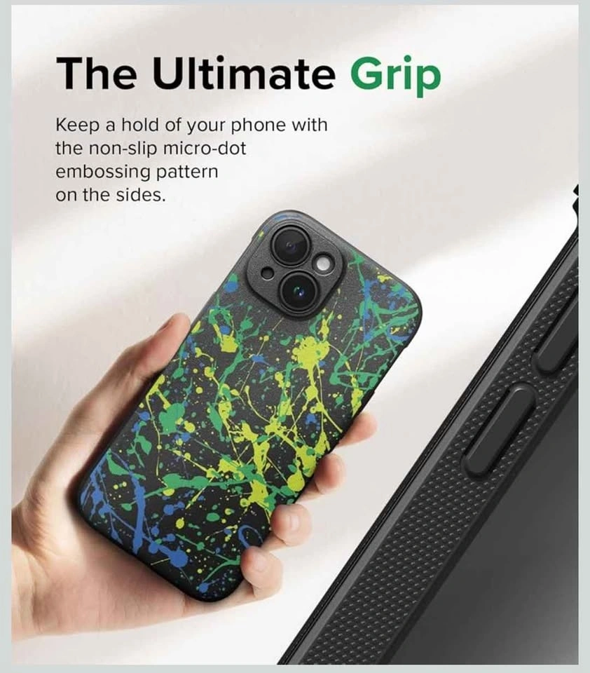 Ringke Onyx case for iPhone 15. Features anti-fingerprint technology, non-slip enhanced grip, and is smudge-proof. Feels good in the hand. Action Painting design.