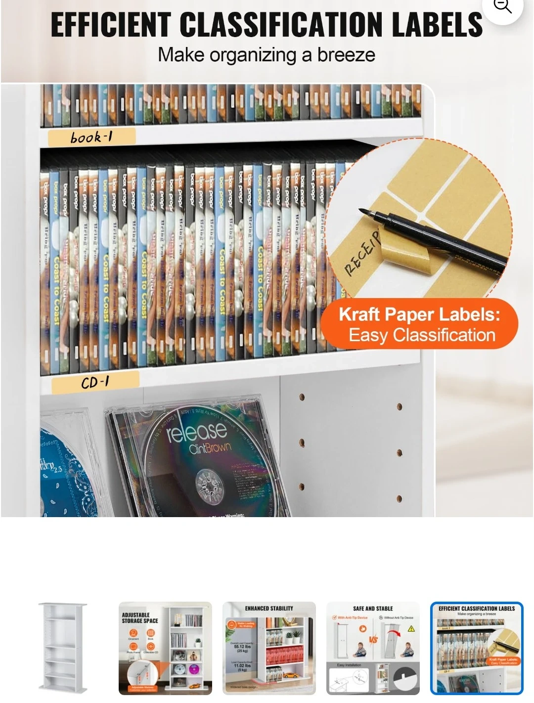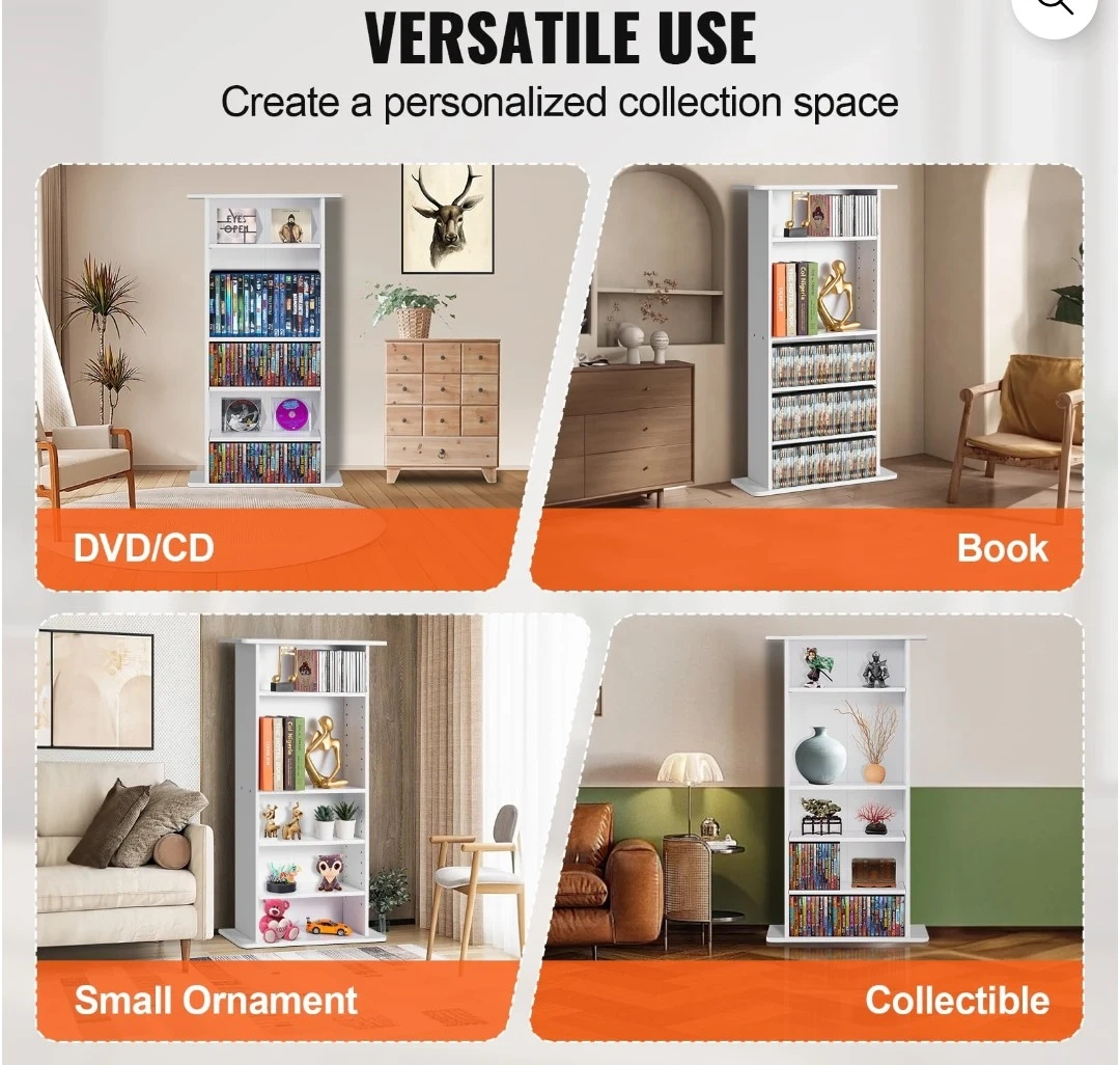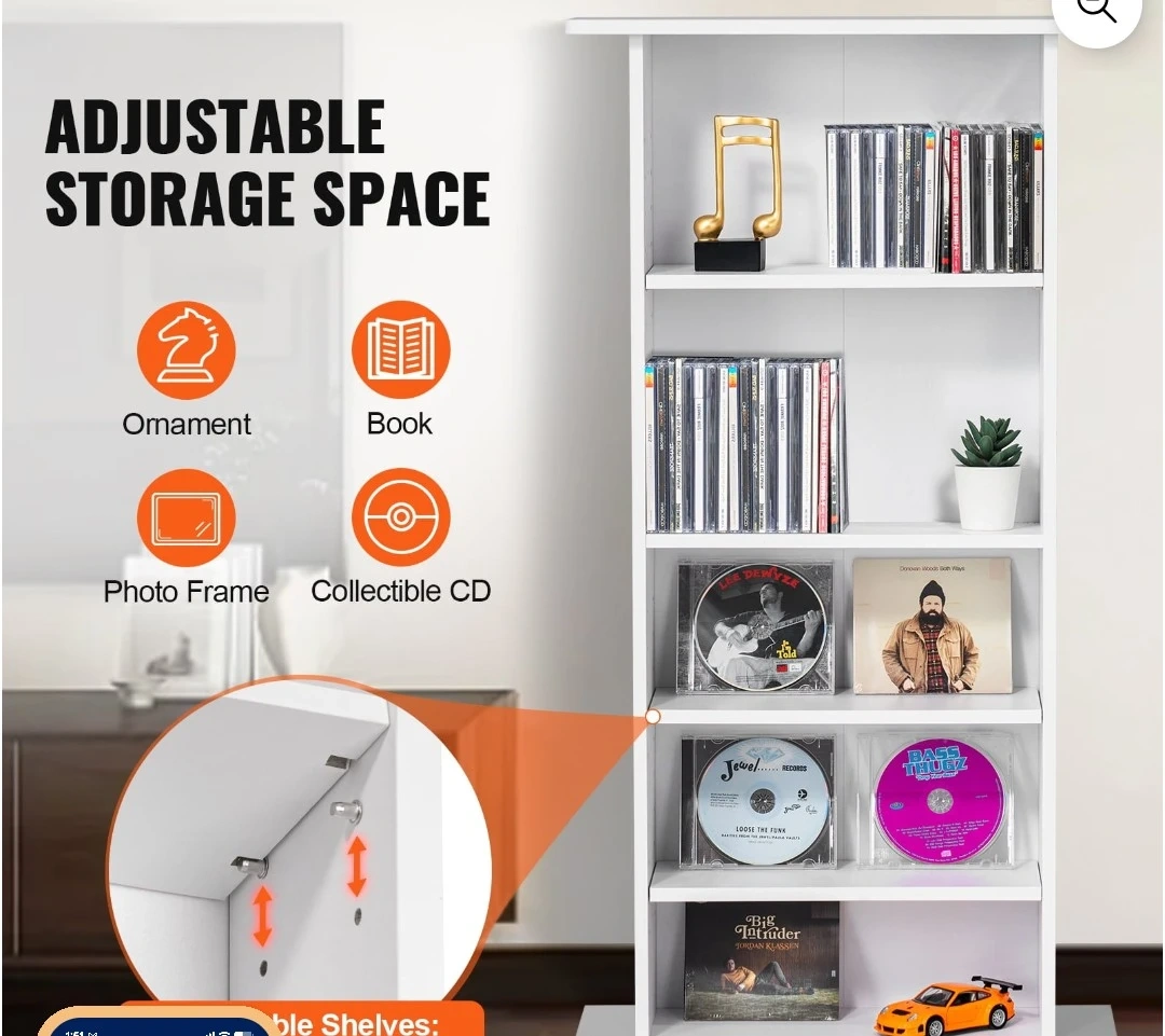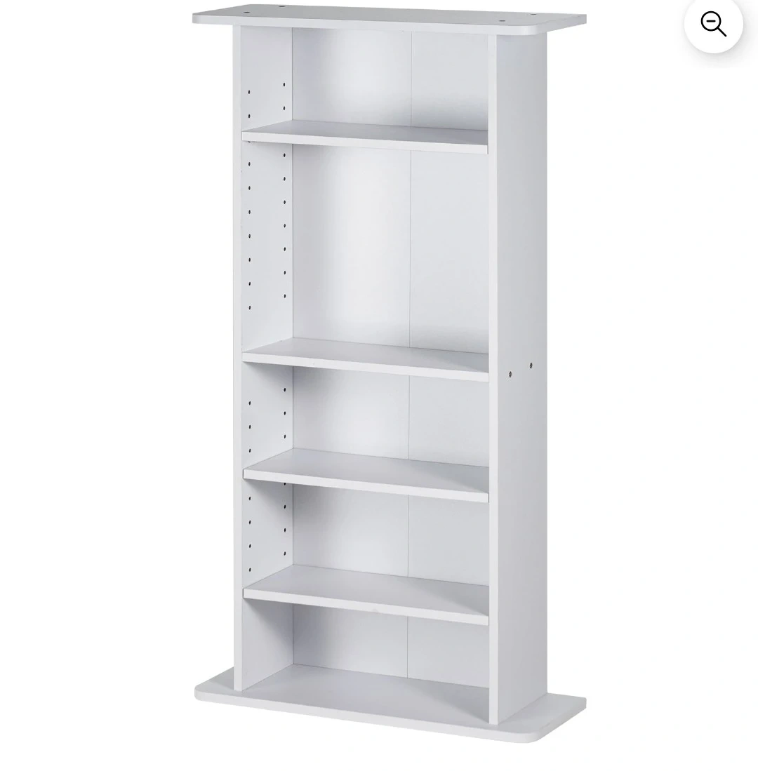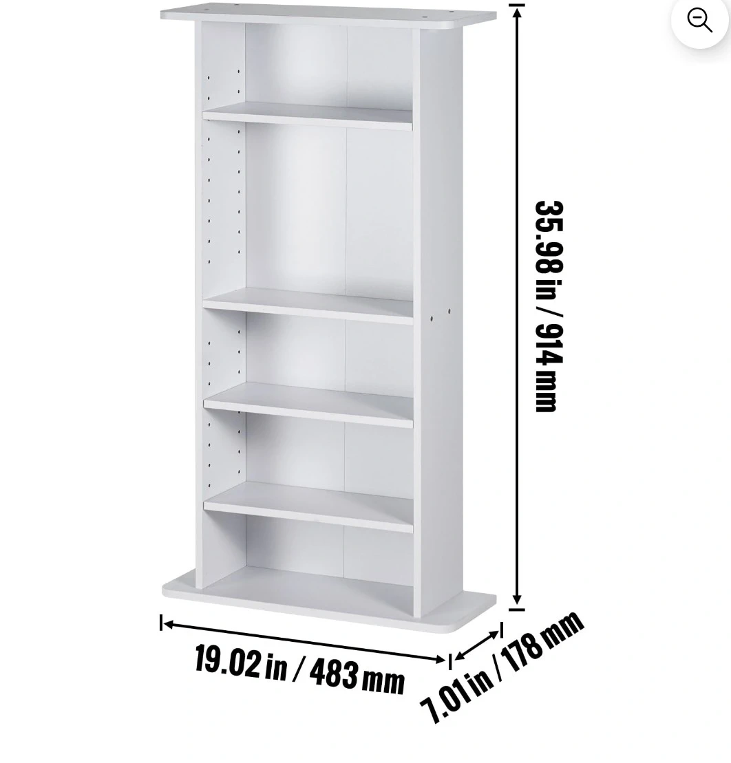 This white media storage tower has 5 shelves. It's made of particle board. Dimensions are 35.98" H x 19.02" W x 7.01" D./6 available. Can deliver same day for extra charge. Beautiful organization shelves. Can assemble for an extra charge.