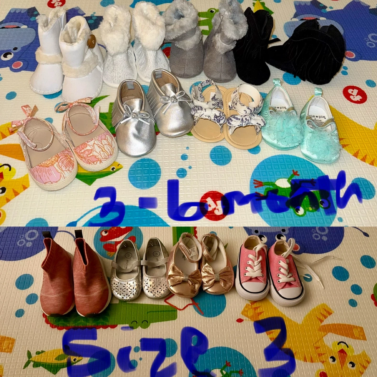 A collection of baby girl shoes, including boots, sandals, and sneakers. Size 3 and sizes 3 to 6 months. Includes various styles and colours perfect for little feet.
