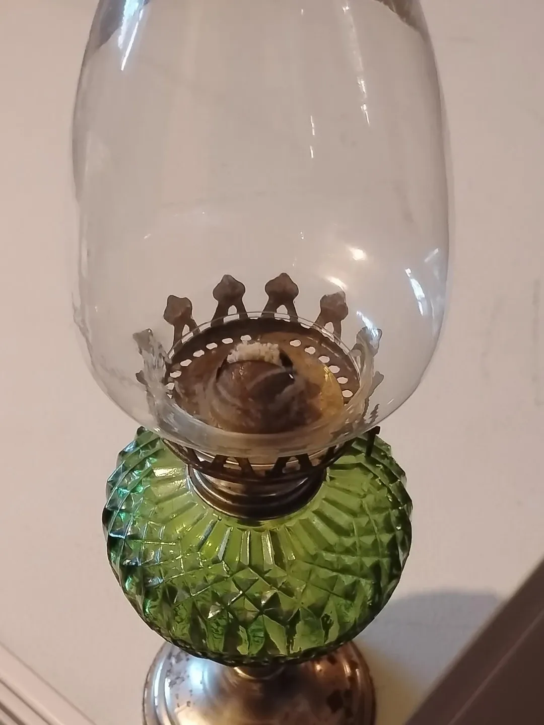 This is a decorative oil lamp with a green glass base and a clear glass chimney. The base has a diamond-cut pattern. It's ready to be refilled and lit!