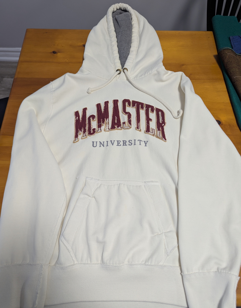 Selling a cream-coloured McMaster University hoodie. It features the McMaster University logo embroidered across the chest and has a cozy hood with drawstrings. Perfect for any McMaster student or alumni!