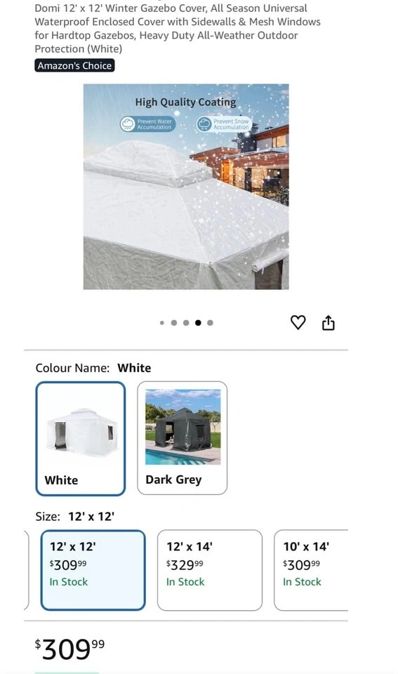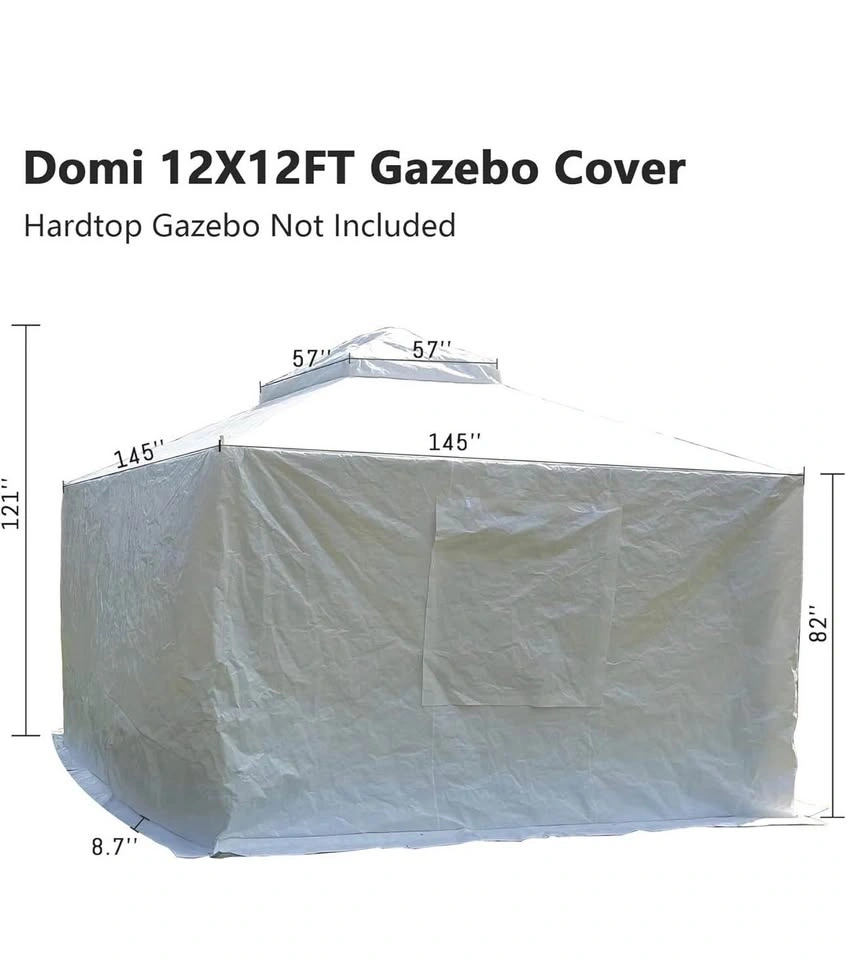 Brand new Domi 12’ x 12’ winter gazebo cover, still sealed in the box. Heavy-duty all-season enclosure with sidewalls and mesh windows designed to fit most 12x12 hardtop gazebos. Provides excellent protection from wind, rain, snow, and cold weather.
