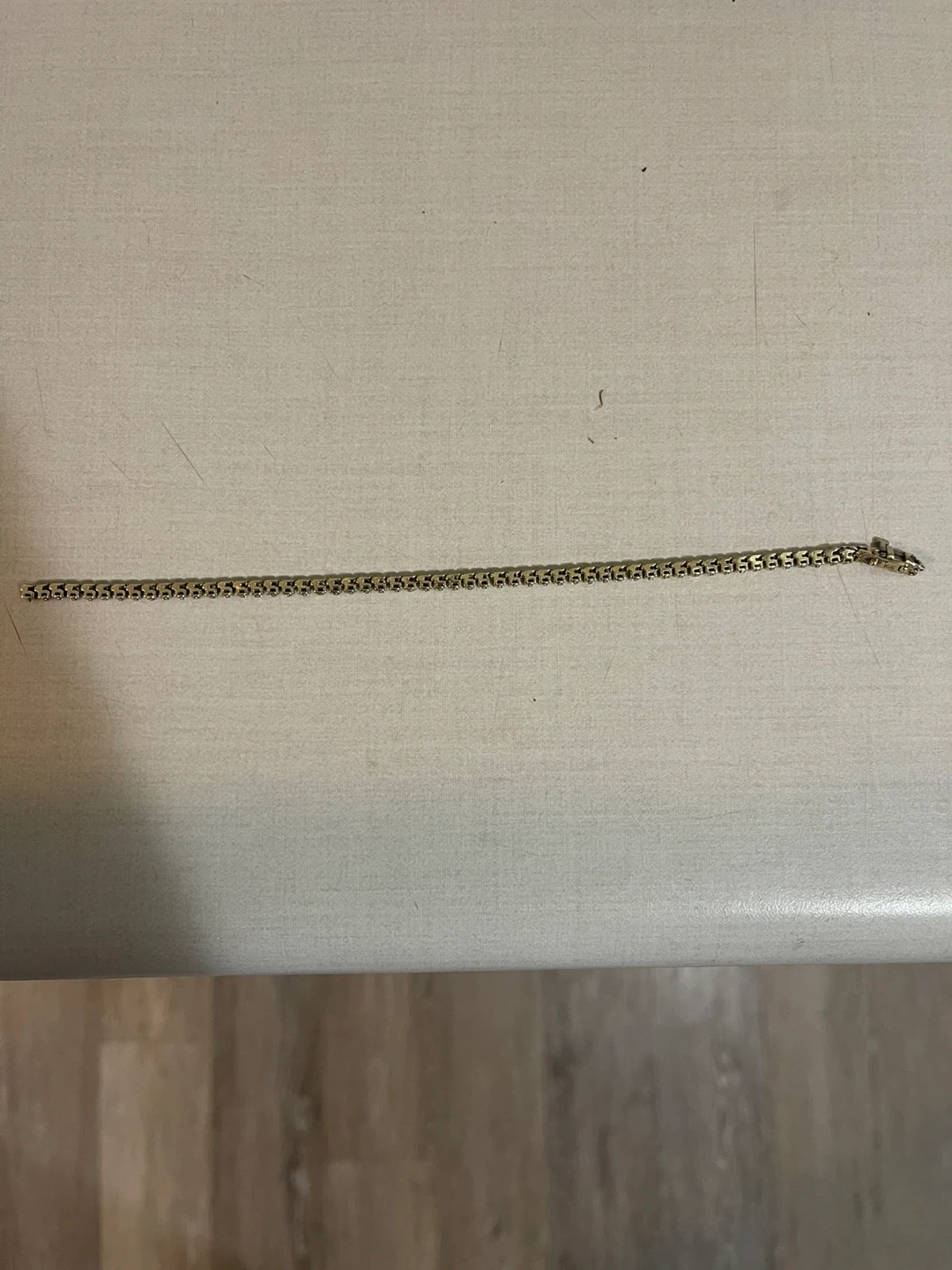 This classic 10k gold tennis bracelet with sparkling diamonds . It's approximately 7 inches long and has a secure clasp closure but is broken can easily get fixed . A lovely accessory for any occasion! 8.85 grams