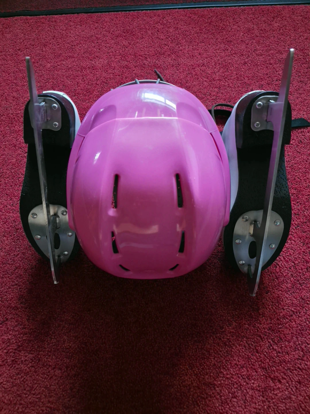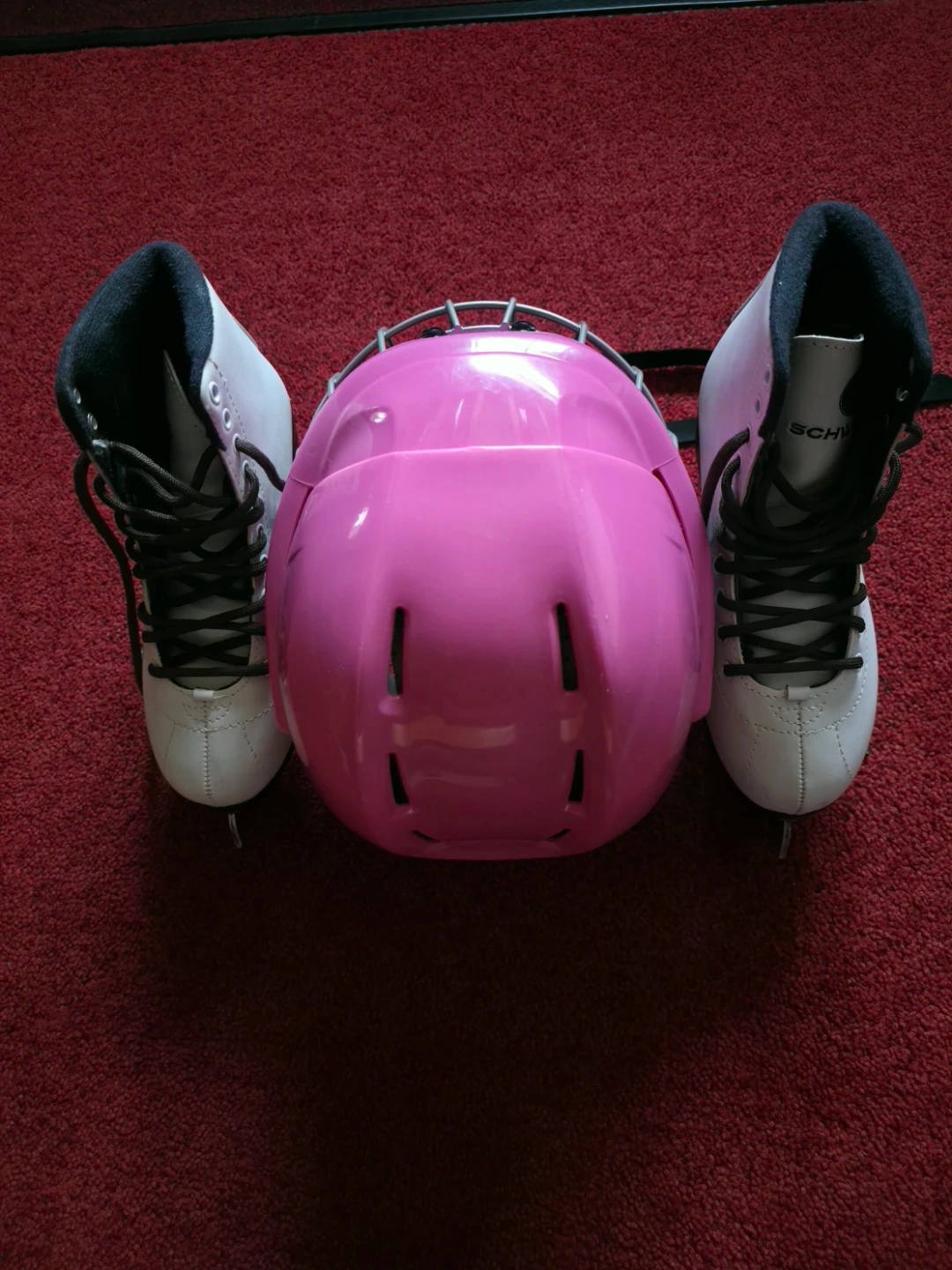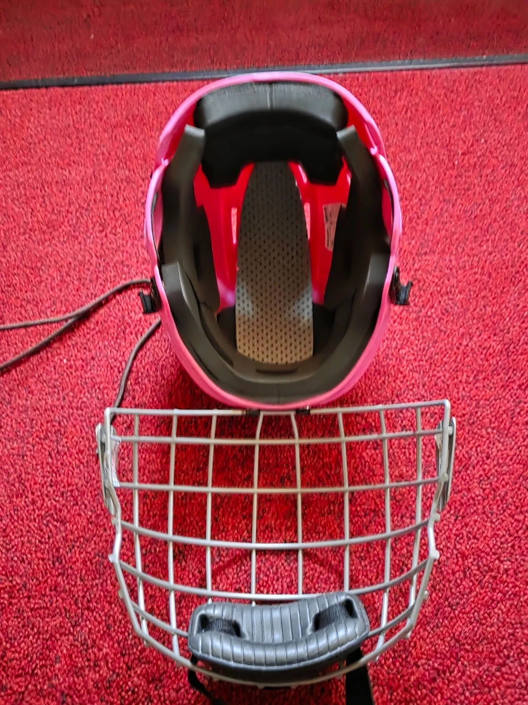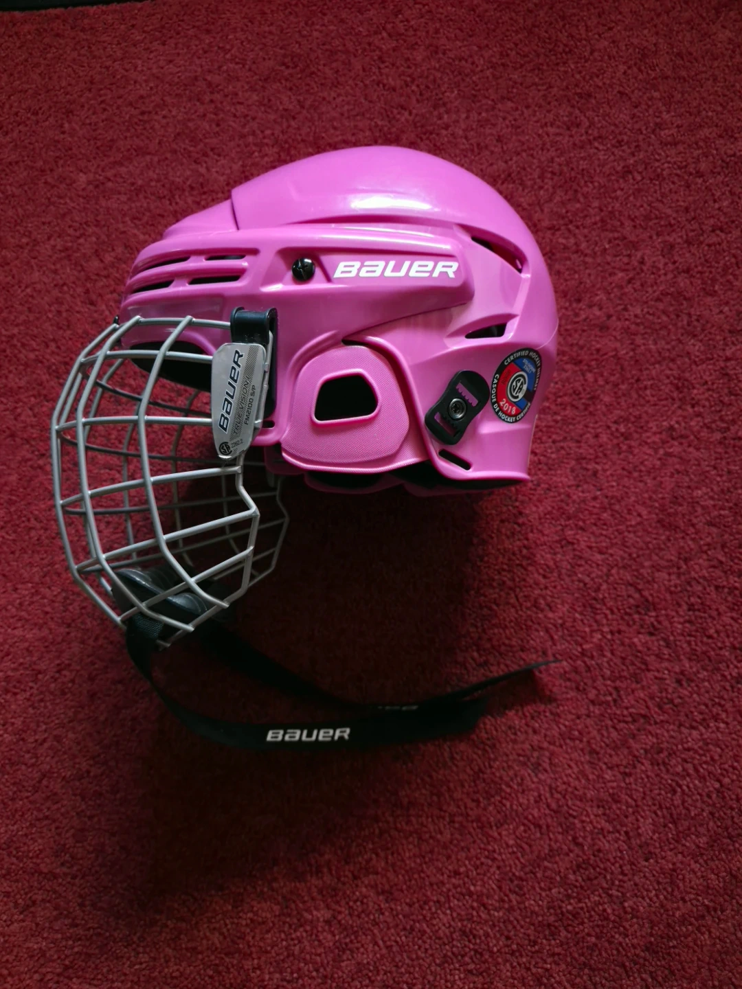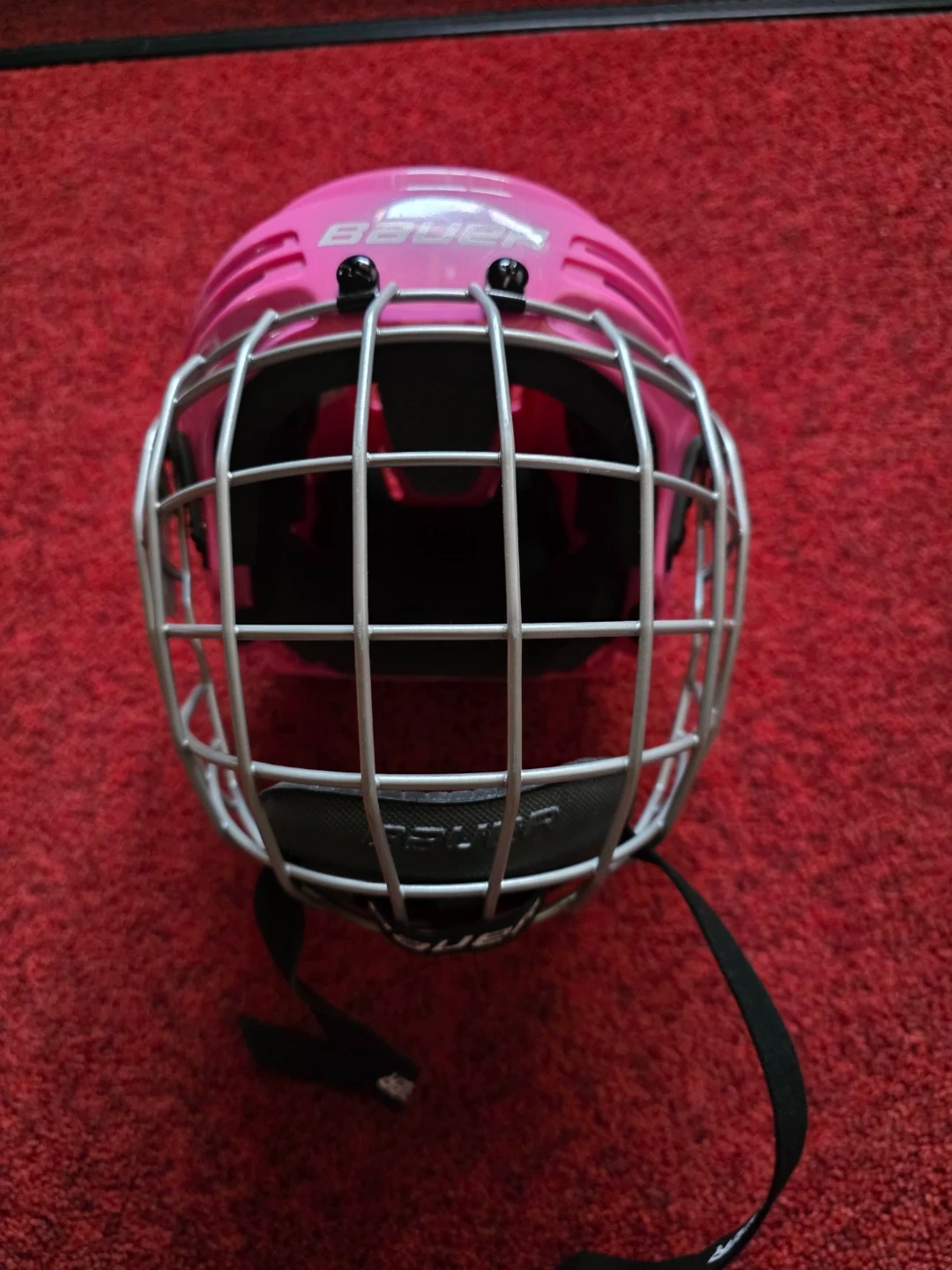 This is a pink Bauer hockey helmet, complete with a protective face cage. It's designed for safety on the ice. It's suitable for players who need a reliable helmet for the game.