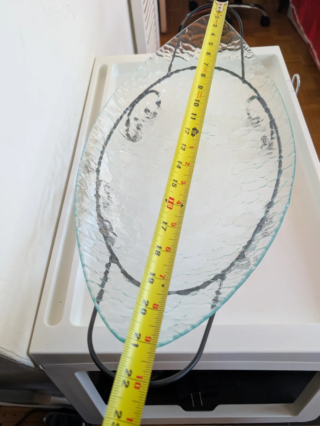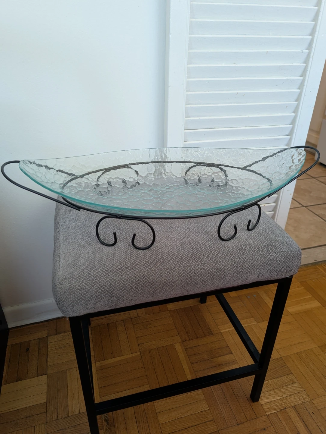 Clear textured glass oval serving tray with a black metal stand. It's approximately 15 inches long and 5.5 inches wide. The tray's textured surface adds a decorative touch. Great for serving snacks, fruit , meet or as a decorative centrepiece!
