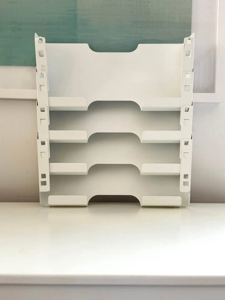 This discontinued piece embodies functional minimalism. It's made of heavy-duty matte white powder-coated steel with 4 cascading tiers, perfect for creating a clean, architectural look.