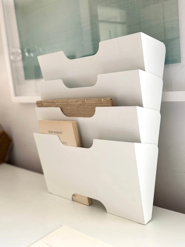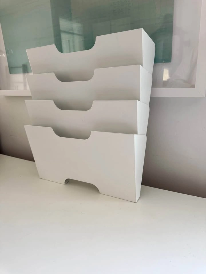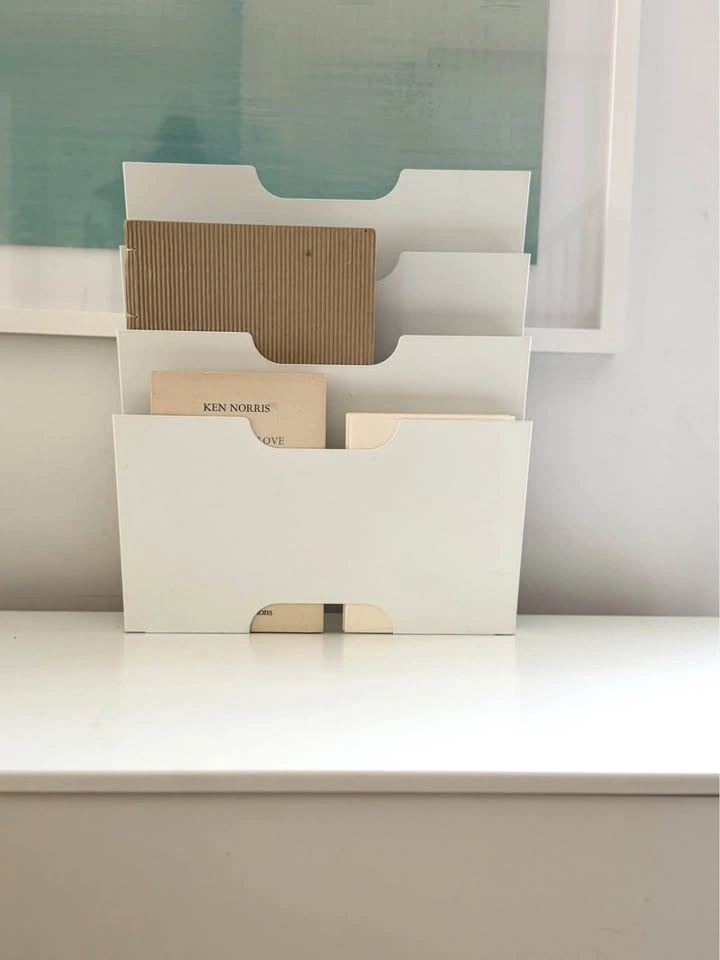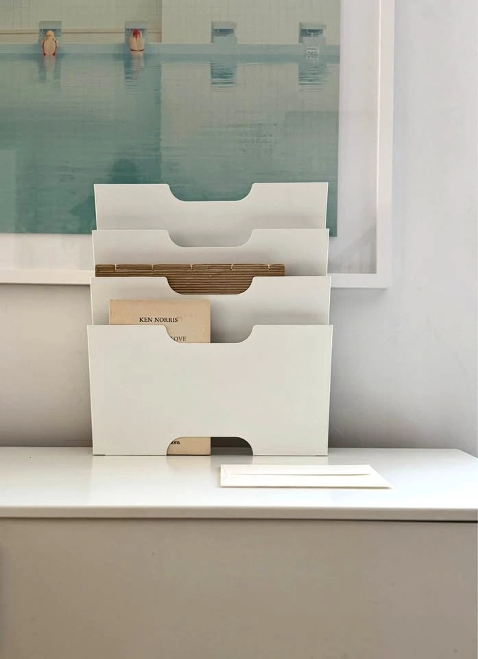 This discontinued piece embodies functional minimalism. It's made of heavy-duty matte white powder-coated steel with 4 cascading tiers, perfect for creating a clean, architectural look.