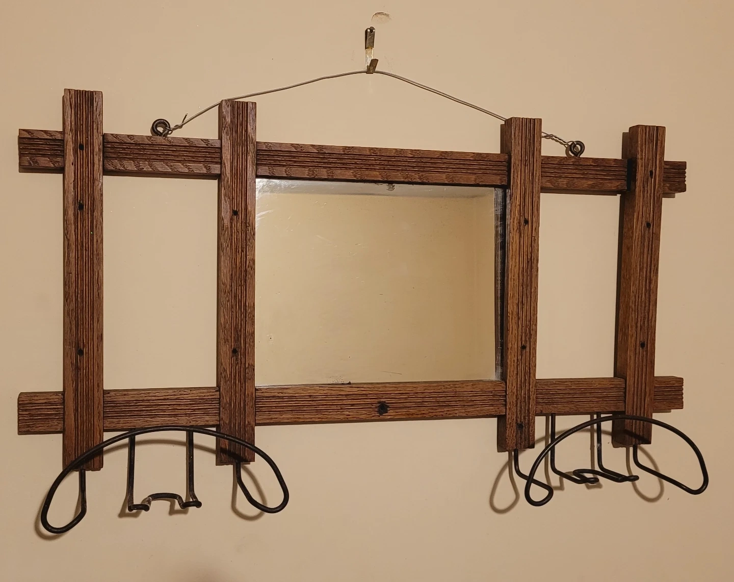 Antique oak wall mirror with metal hangers. In good condition.