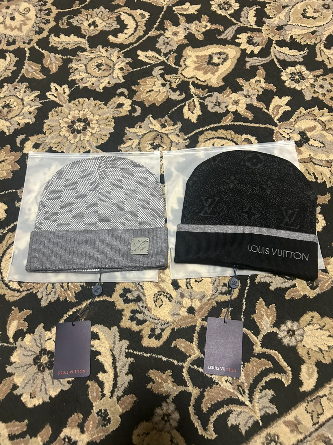 Selling two Louis Vuitton beanie hats. One is grey with a checkered pattern, and the other is black with the LV logo. Both are in great condition! Both go for 50 each!