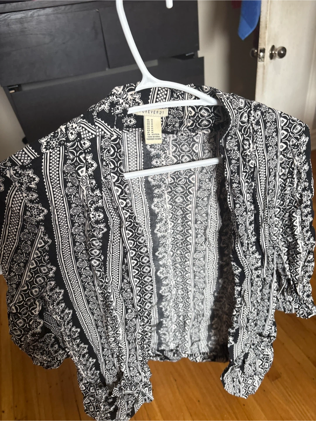 This is a Forever 21 short-sleeve button-up shirt with a black and white print. It's a size medium. Made in China.