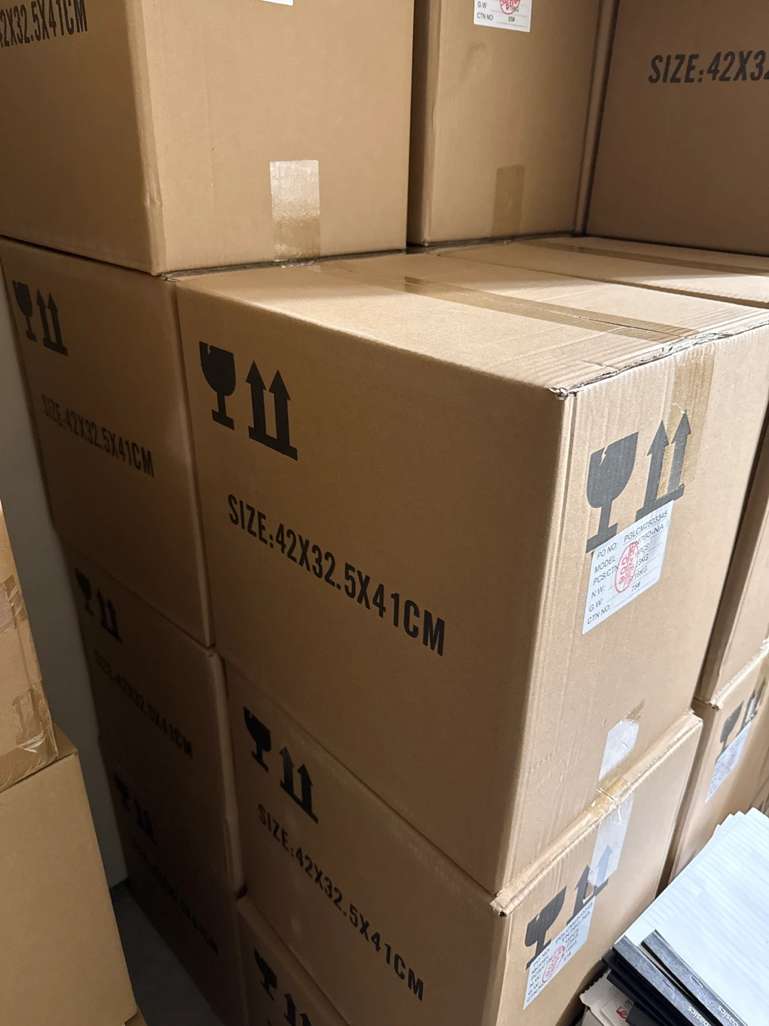 Pack of heavy-duty cardboard boxes. Dimensions are 42x32.5x41cm, and other some sizes. These boxes are perfect for moving or storage needs. They're sturdy and reliable! About 15 to 20 of them.