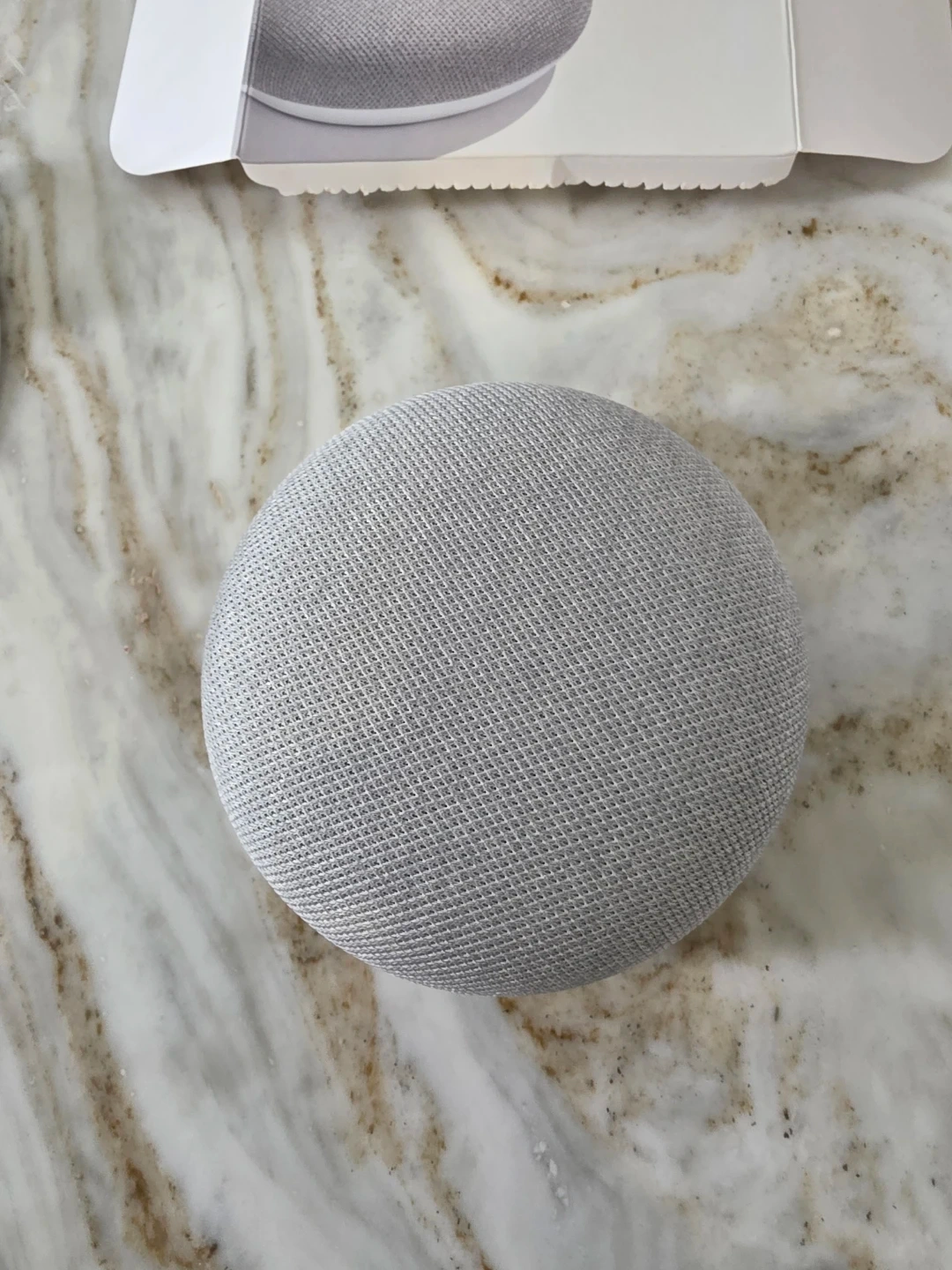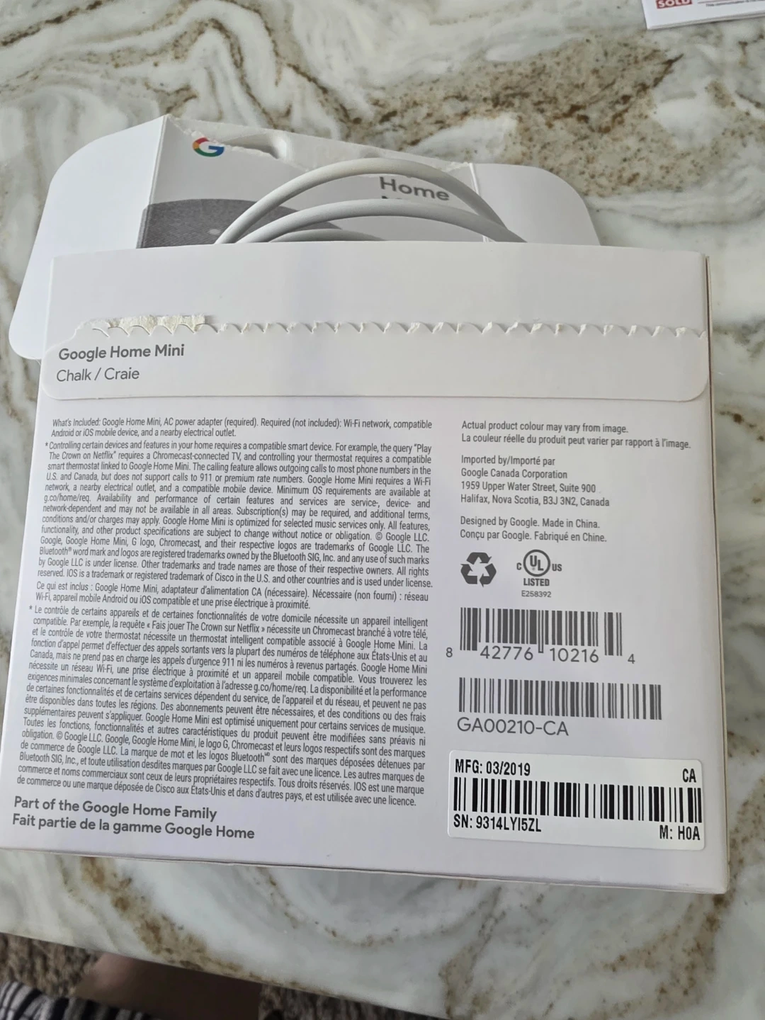 This is a Google Home Mini smart speaker in Chalk. It's a compact device that connects to your Wi-Fi network. It comes with an AC power adapter and cable. MFG: 03/2019.