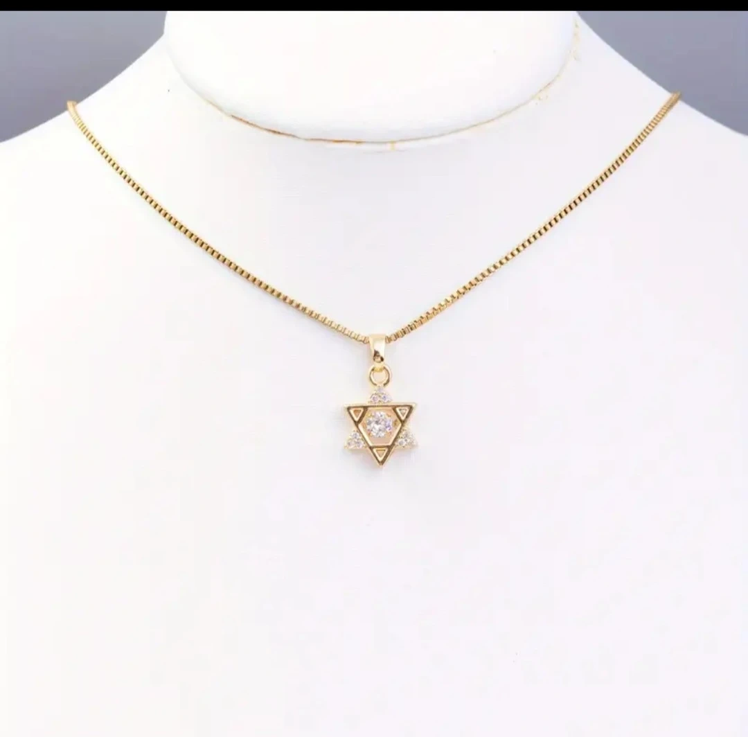This is a lovely gold-tone Star of David pendant necklace! The chain length is approximately 15.35 inches with an additional 2.55-inch extension. The pendant itself is about 0.78 inches in size. It's a beautiful piece to add to your jewelry collection!
