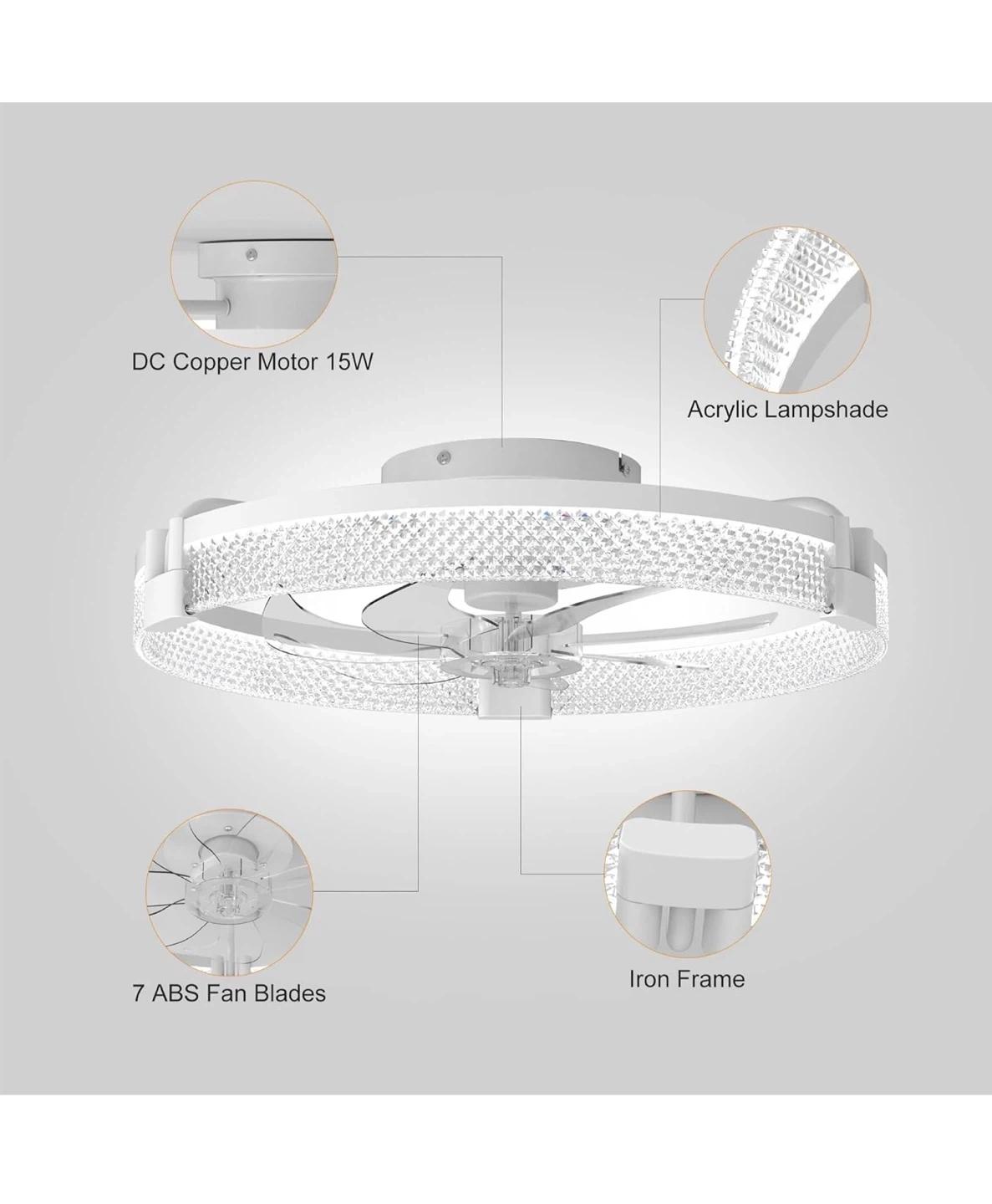 This ceiling fan features a 19.7-inch diameter with integrated dimmable LED lights. It's equipped with a DC motor and offers 6 wind speeds, with summer forward and winter reverse airflow options. Includes remote control for color temperature adjustment (3000K-6000K) and brightness control (10%-100%). Material: Iron+Acrylic+ABS. Room size: 8-15m².