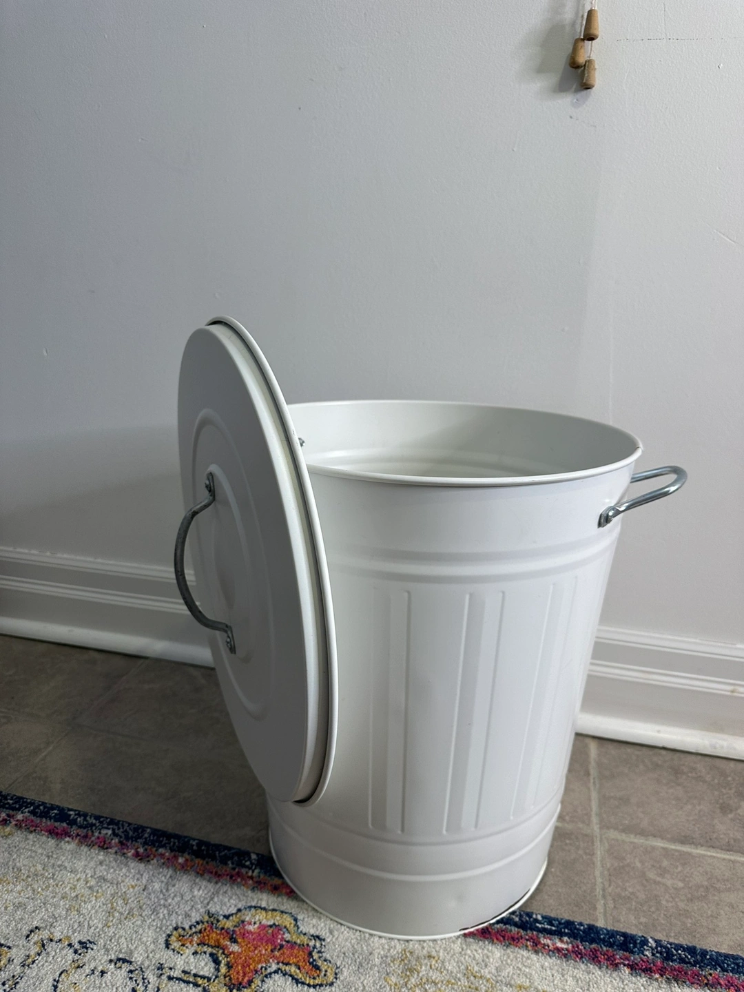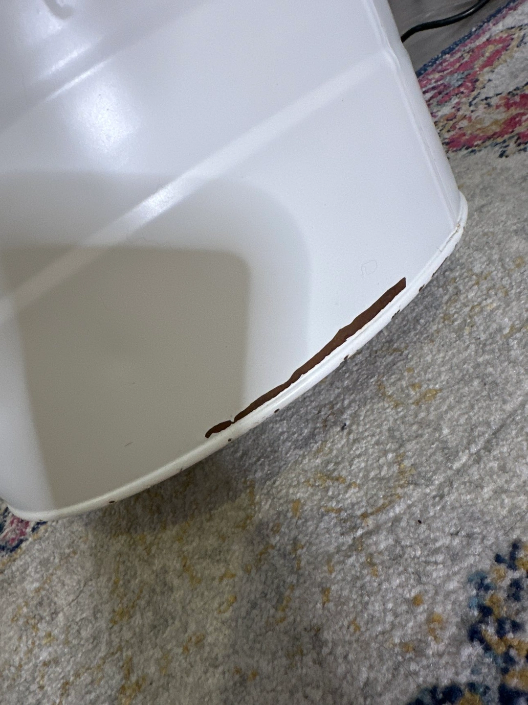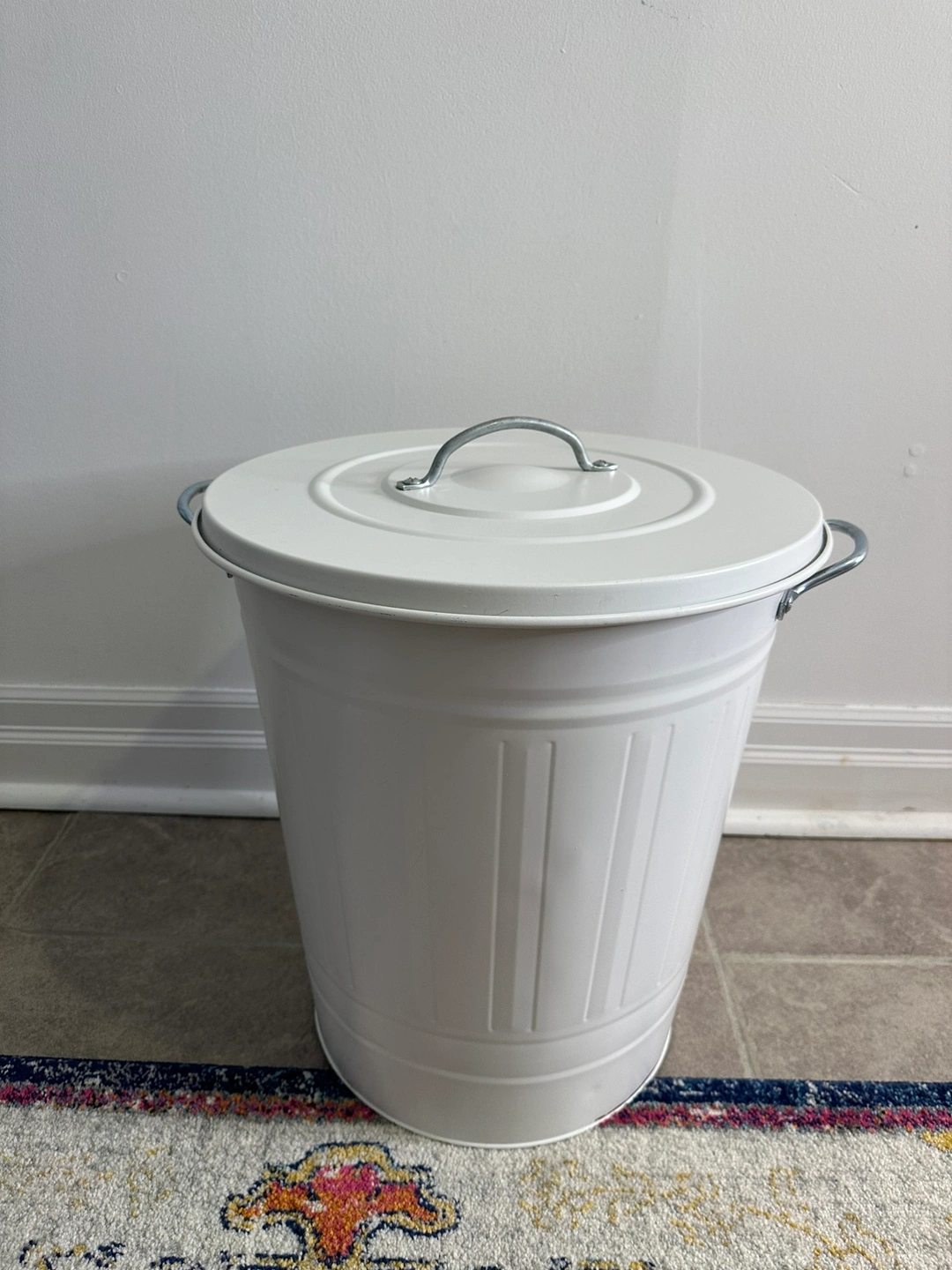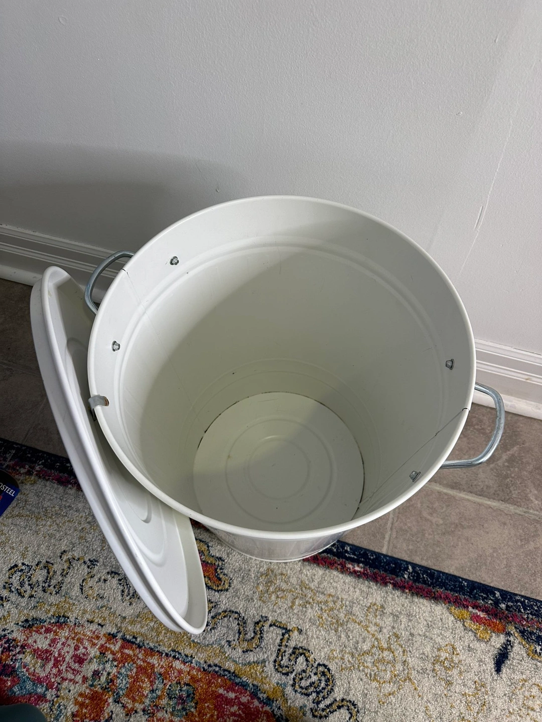 This bin is like new except for some rust on the inside at the bottom, but..that’s what garbage bags are for! Also a bit of chipping on bottom at outside (see pics)