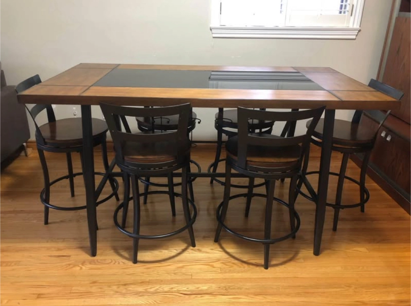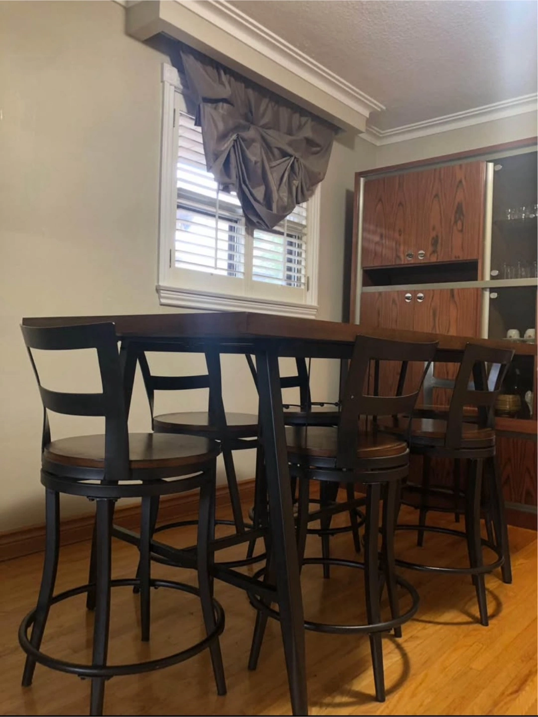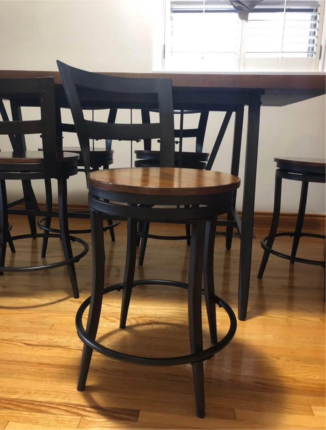 Selling a high top table with six chairs. It's perfect for a dining room. The chairs have a swivel function for easy movement.