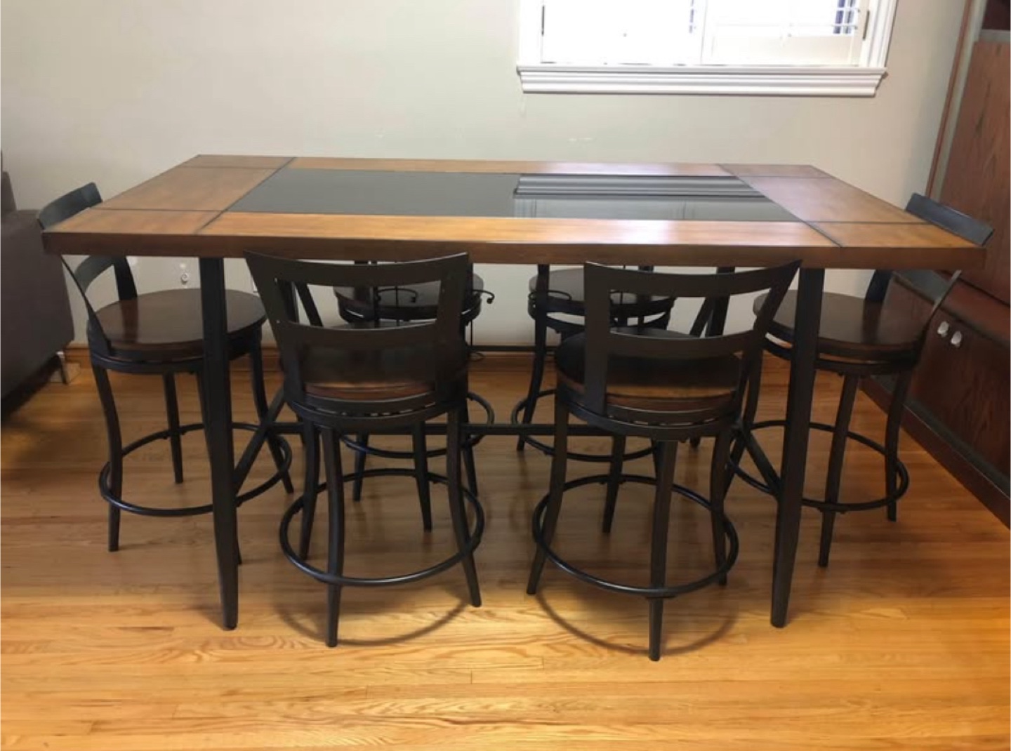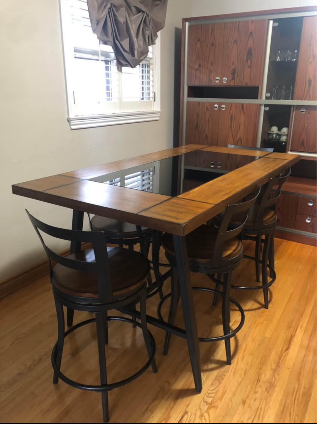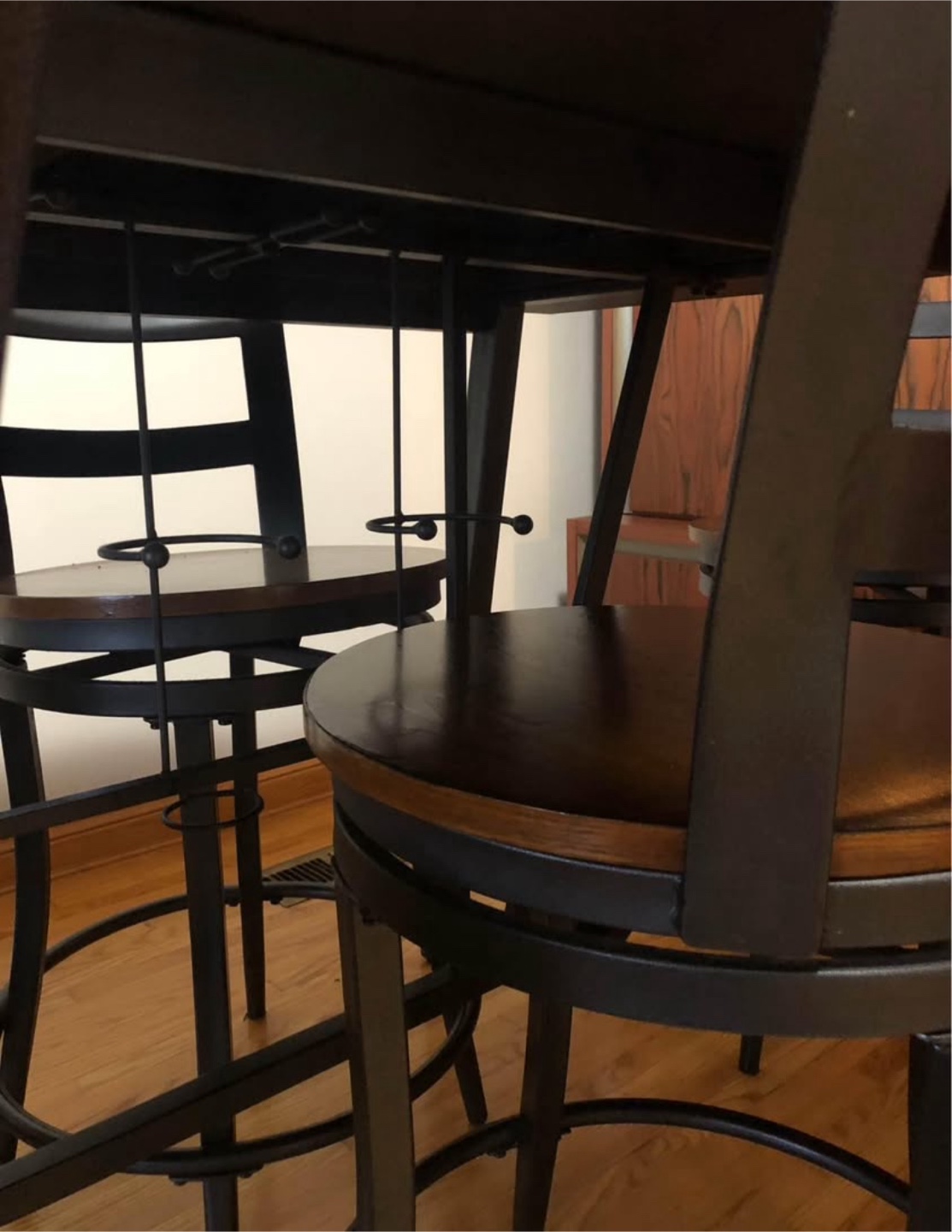 Selling a high top table with six chairs. It's perfect for a dining room. The chairs have a swivel function for easy movement.