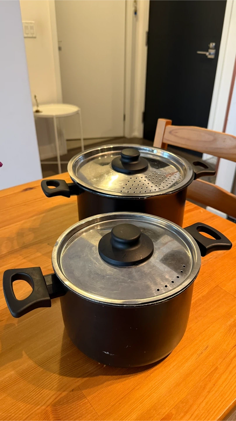 Two black stock pots included, each with a matching lid featuring a strainer function. The pots have sturdy black handles and are made of a durable material. These pots are great for boiling, steaming, or straining pasta and vegetables.