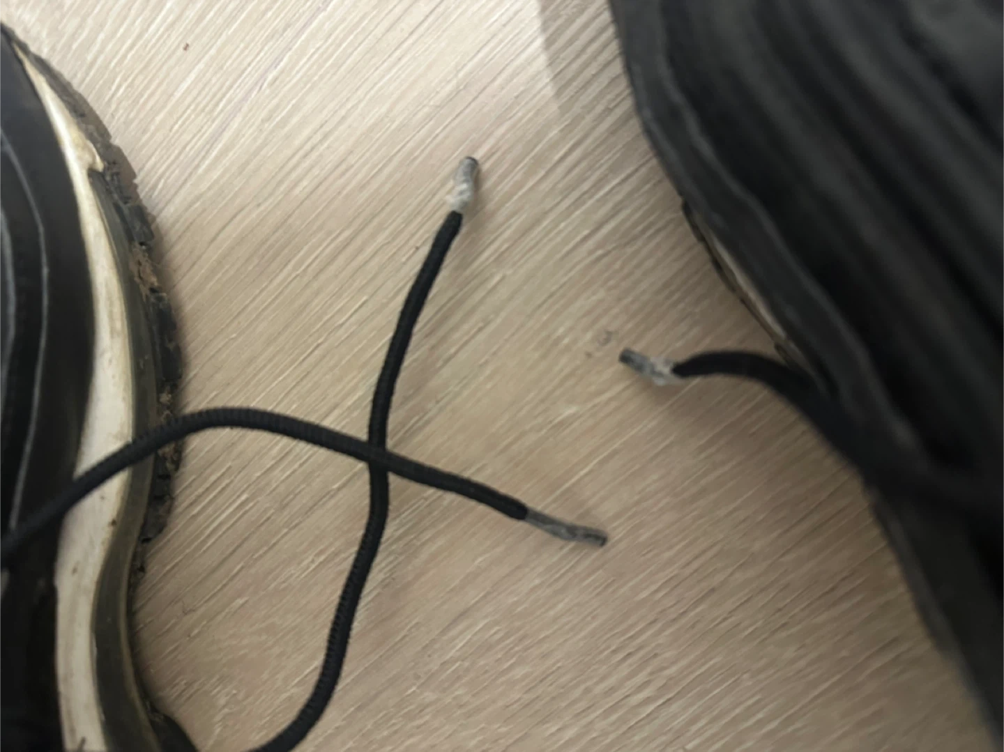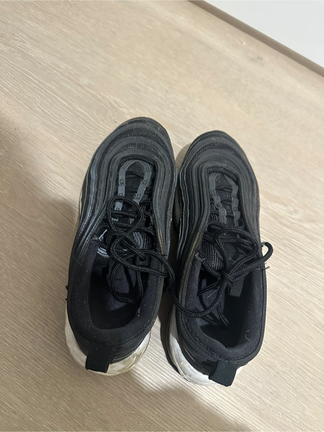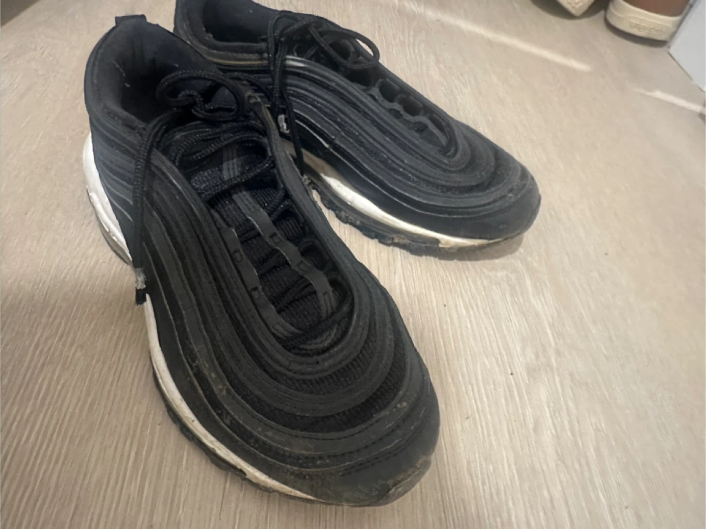 Selling a pair of Nike Air Max in black, size US 7.5. They have some wear and tear, as you can see in the photos, but still have plenty of life left! the laces are a little frayed on the plastic my dog bit on it
