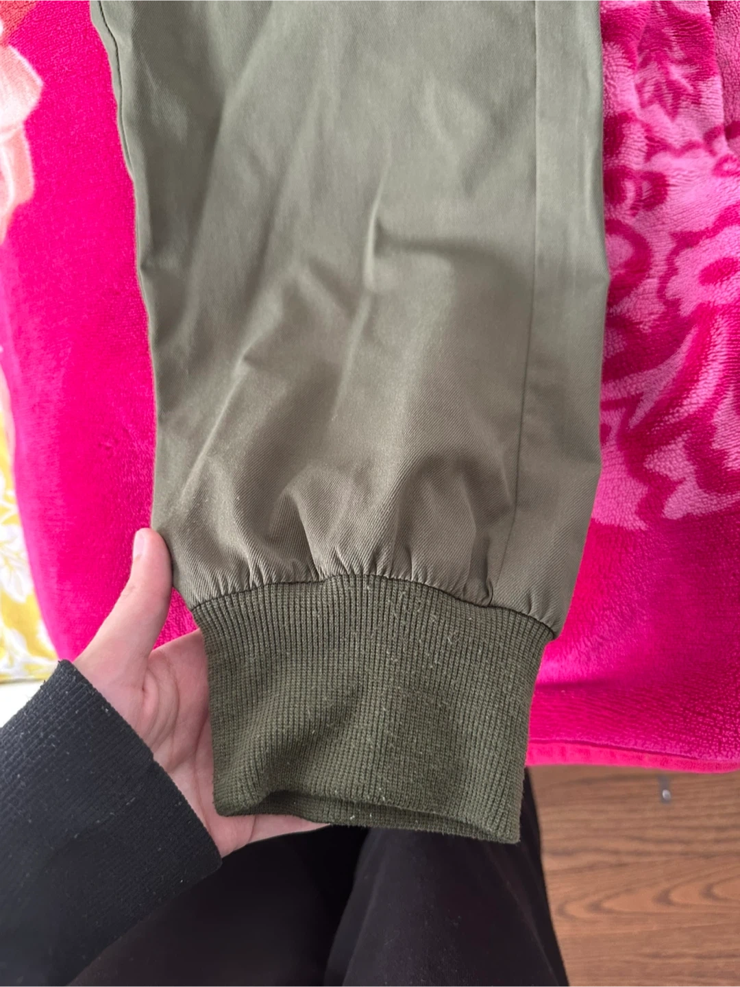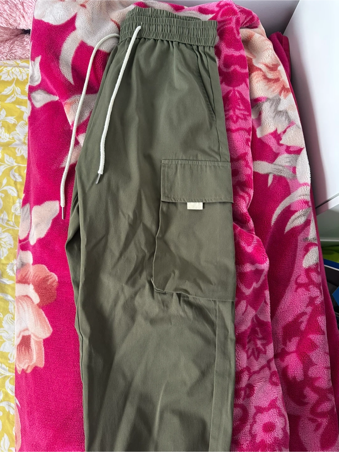 Comfy olive green cargo joggers. Has elastic waistband with white drawstring. Side pockets and cargo pockets on the legs. Ribbed cuffs too.