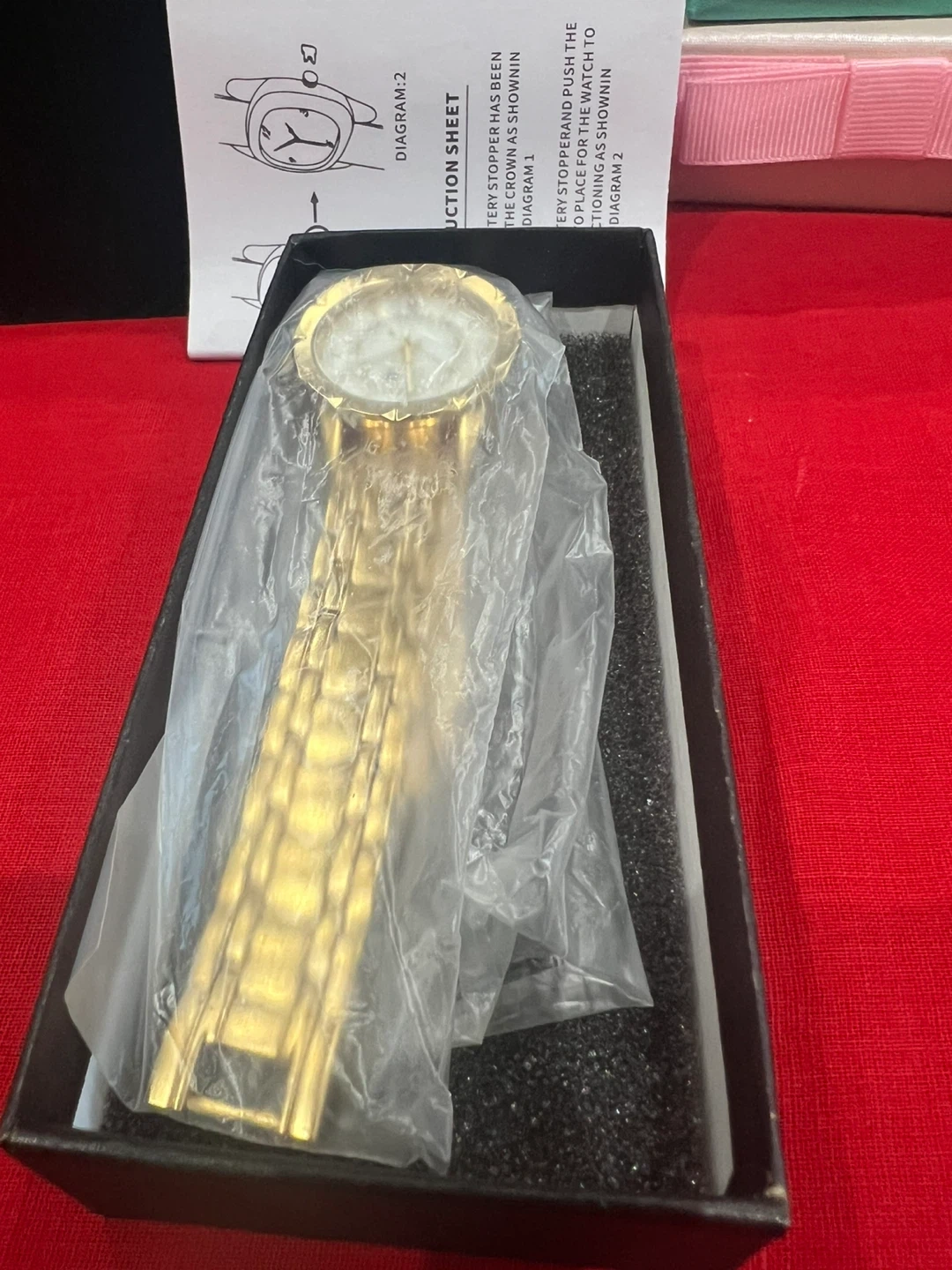 Selling a brand new watch in gold with crystal accents. It comes with the original box and instructions. This watch is in pristine condition and ready to wear! Also water resistance
