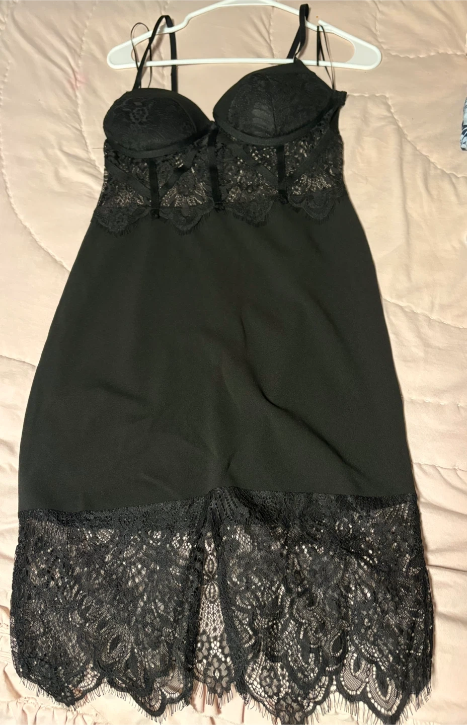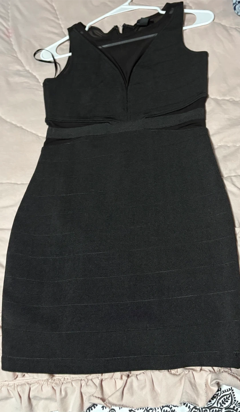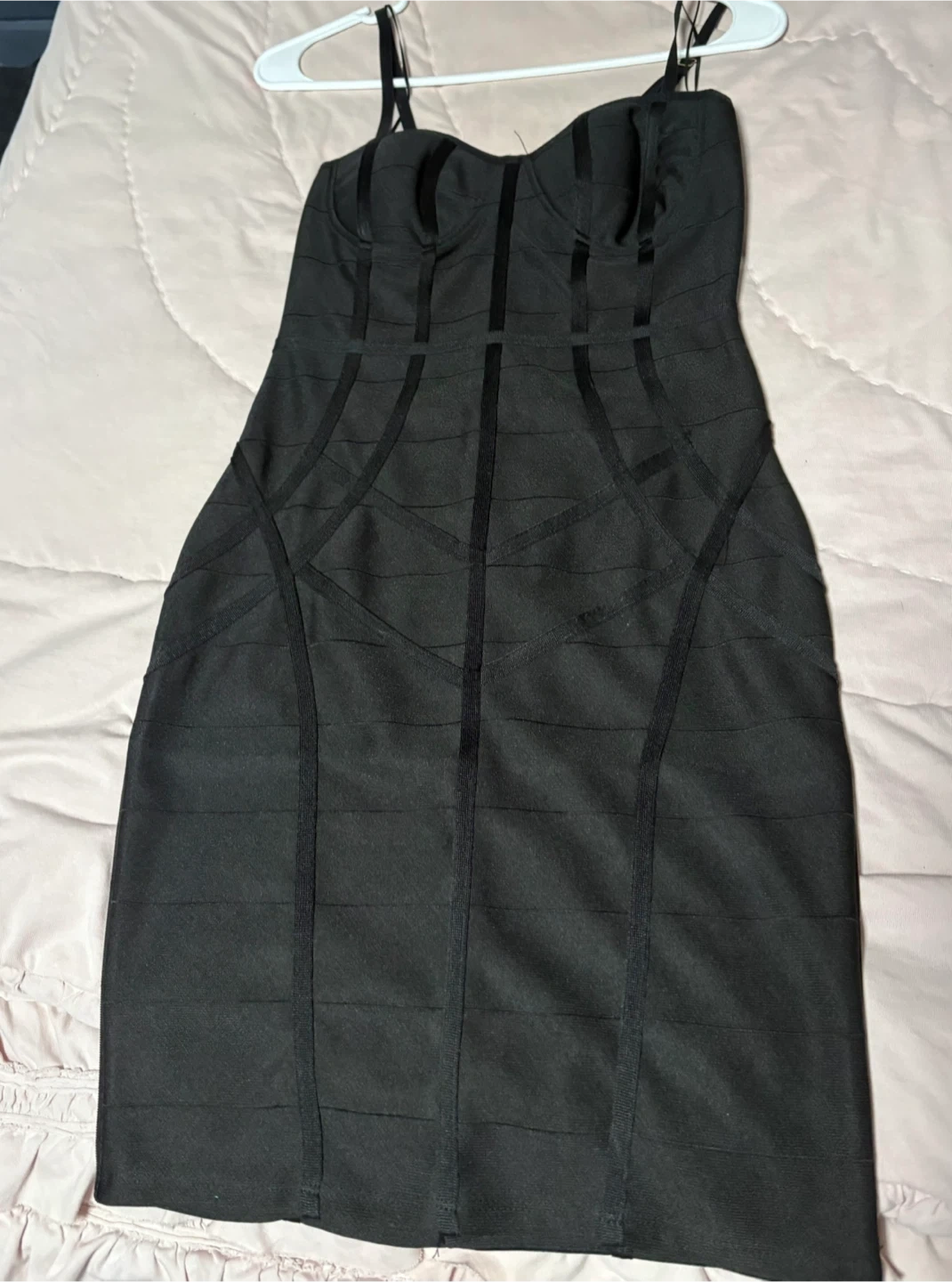 This is a5 black bandage dresses. It features a V-neckline and a knee-length hem. Made from a stretchy material for a snug fit.