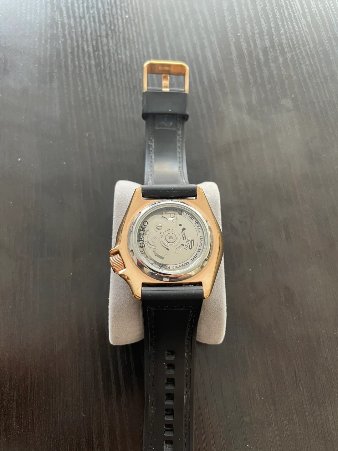 Classic Seiko 5 automatic watch with a black dial and rose gold-tone case. Features a date and day display. It has a black leather strap.