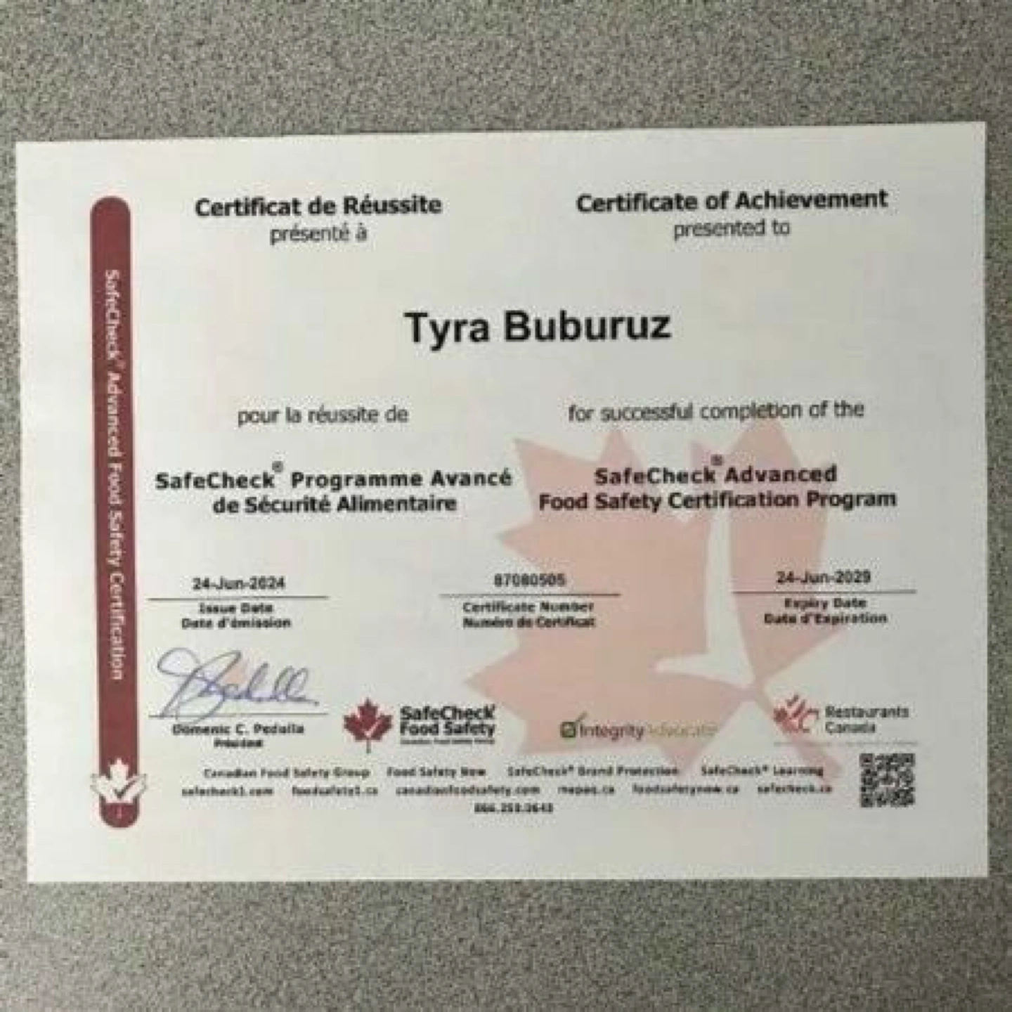 I have the SafeCheck® Advanced Food Safety Certification. Tyra Bakes Regina Residential Business Licence # LCB20250044.