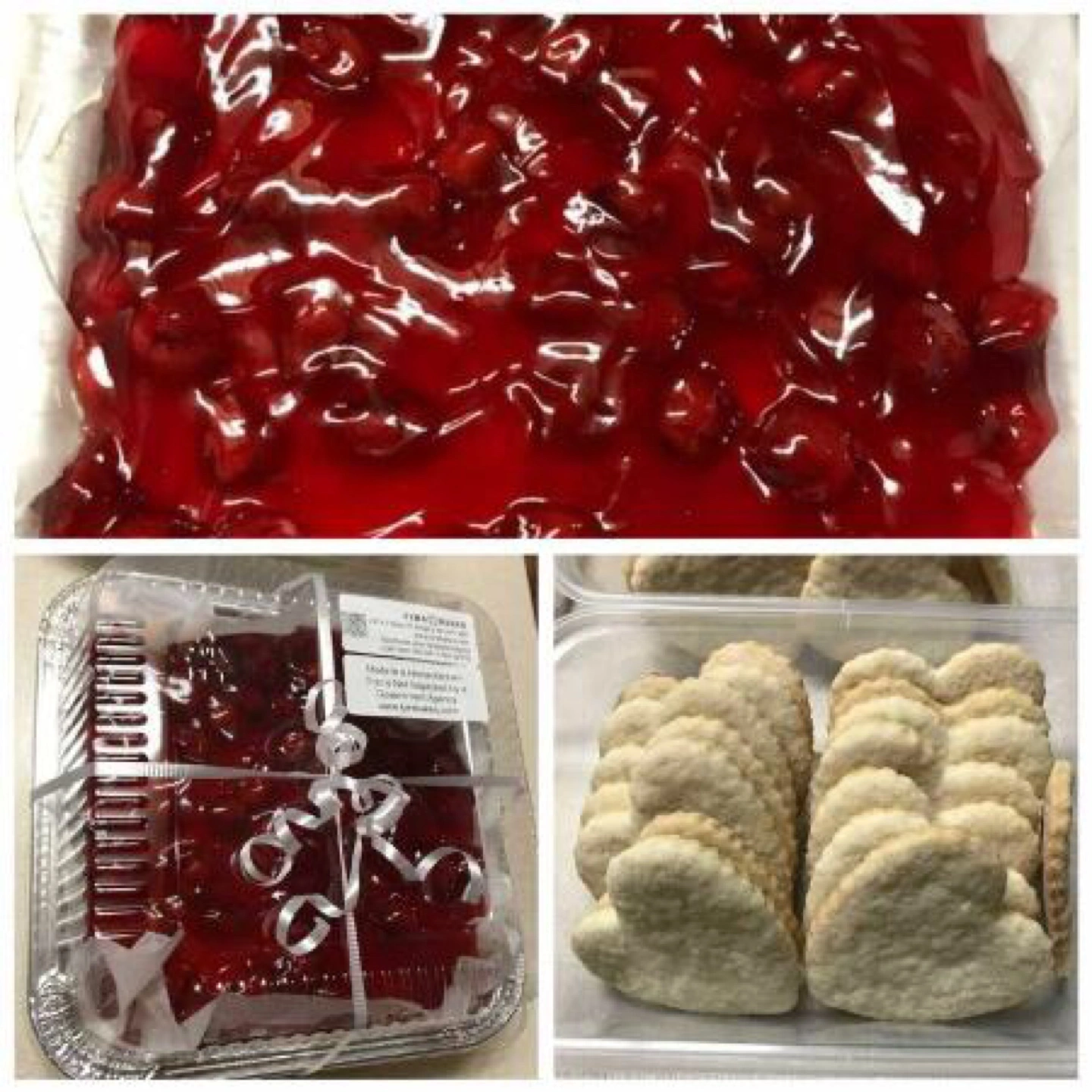 1 lower fat cheesecake featuring a graham cracker crust with real butter with cherry topping PLUS one FREE package of 15 heart shaped sugar cookies.