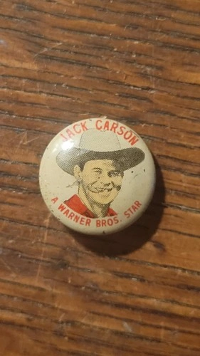 This is an original vintage 1940s lithograph pin featuring Hollywood legend and Warner Bros. star Jack Carson. This pin was originally issued as a "premium" found inside boxes of Quaker Puffed Wheat and Puffed Rice.